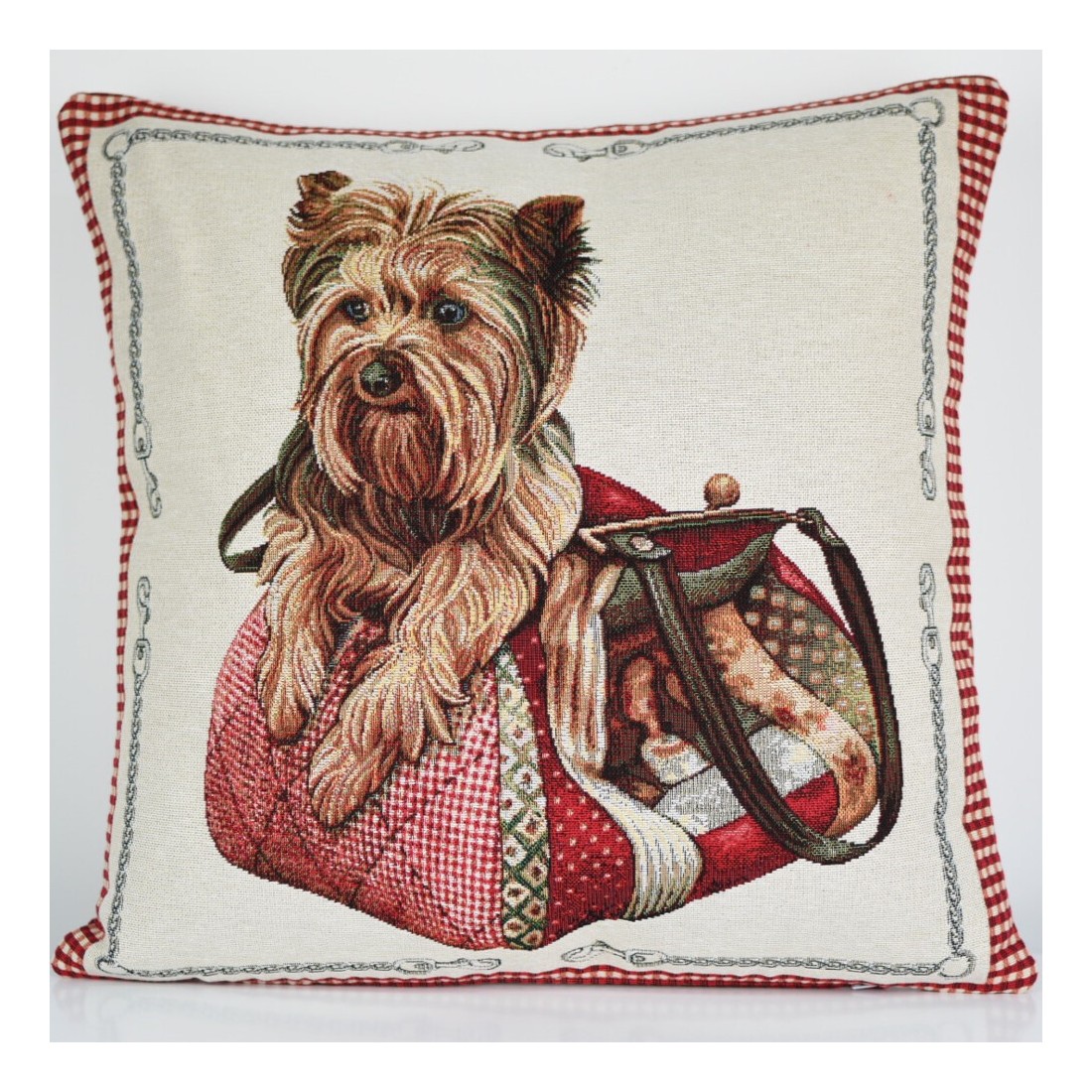 Jacquard cushion cover with a Yorkshire dog looking out from inside a handbag. KETTY. Zipper closure.