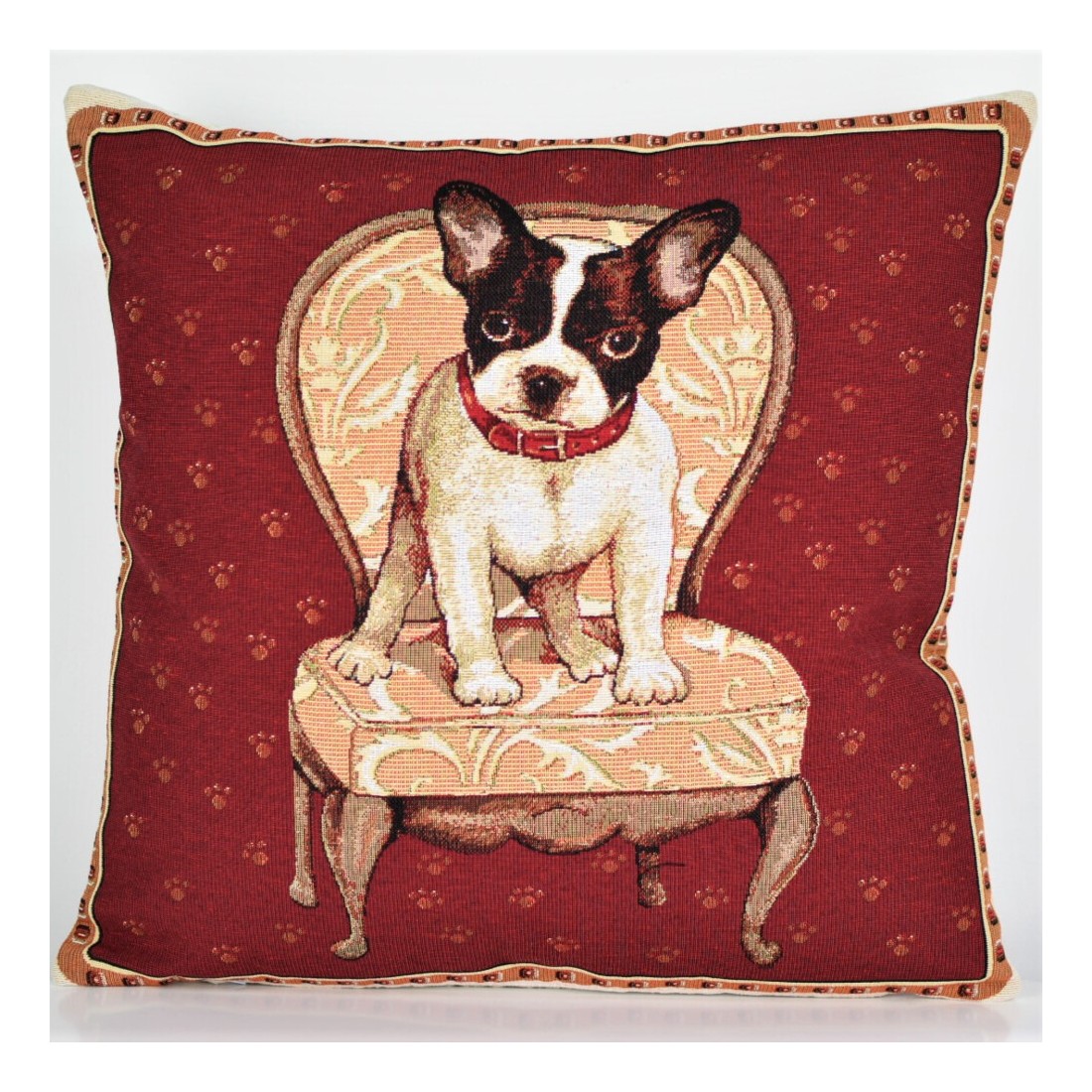 Jacquard cushion cover with a French bulldog, white with a black head, on an elegant chair. ROCKY. Zipper closure.