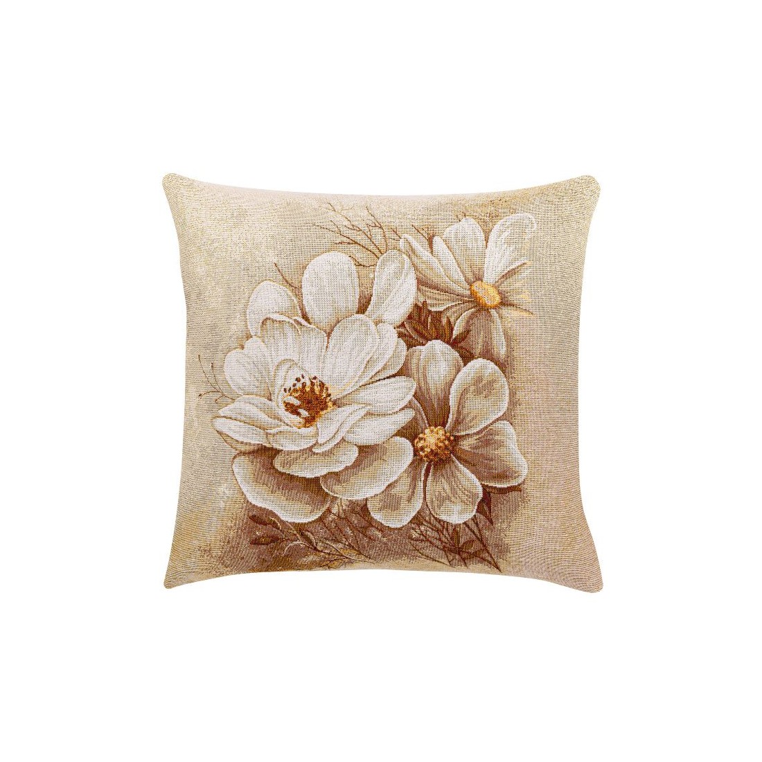 Jacquard cushion cover with white flowers and golden tones on a beige background. NITRA. Zipper closure. Washable