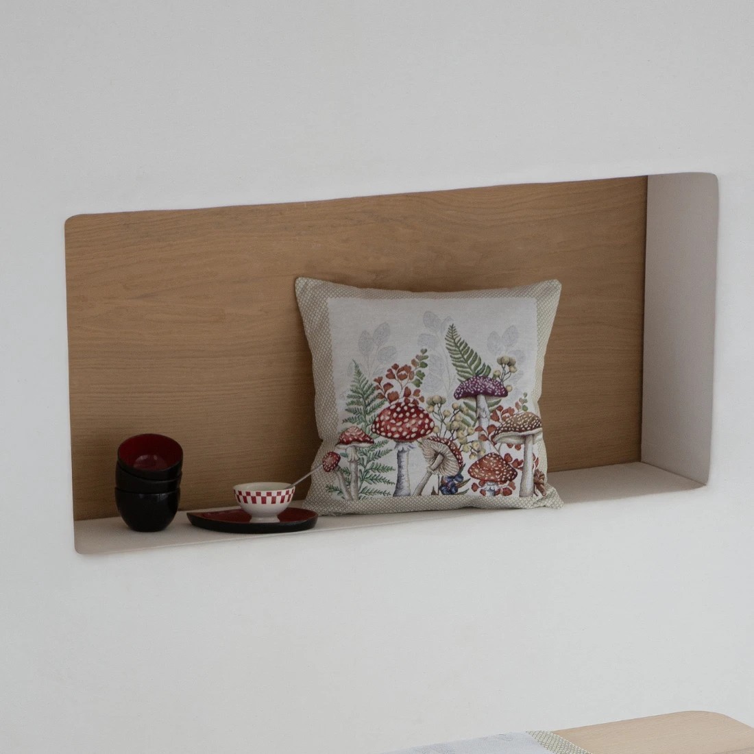 Camino de mesa Jacquard 40x135 cm en fondo beige con diseño botánico con flores y setas...