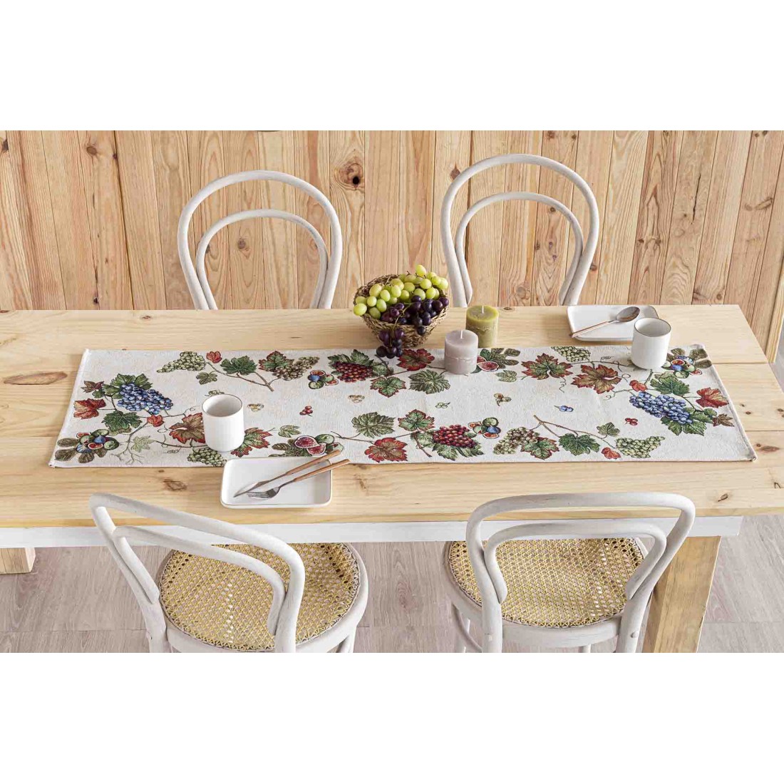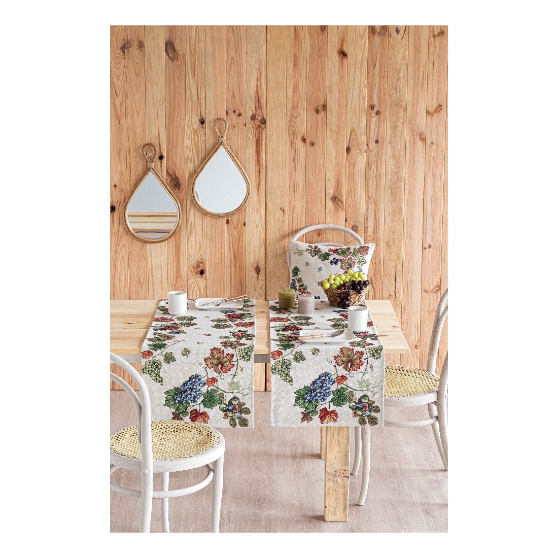 Jacquard table runner with pink and yellow flowers on a beige background. Washable. XANA.