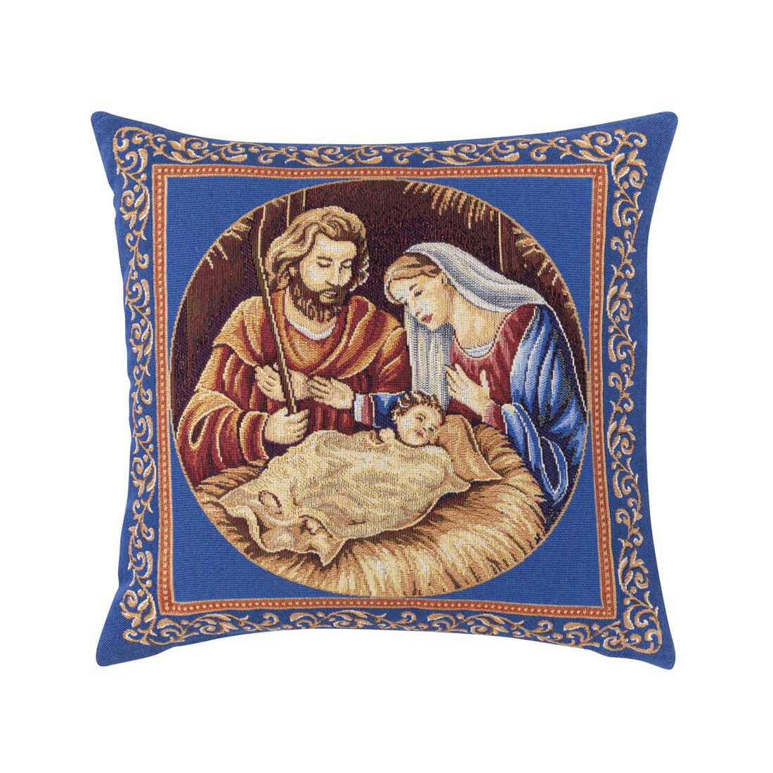 Jacquard cushion cover with the image of the Nativity of Jesus on a blue background with a golden ornamental border. Zipper closure. NATIVIDAD C.22