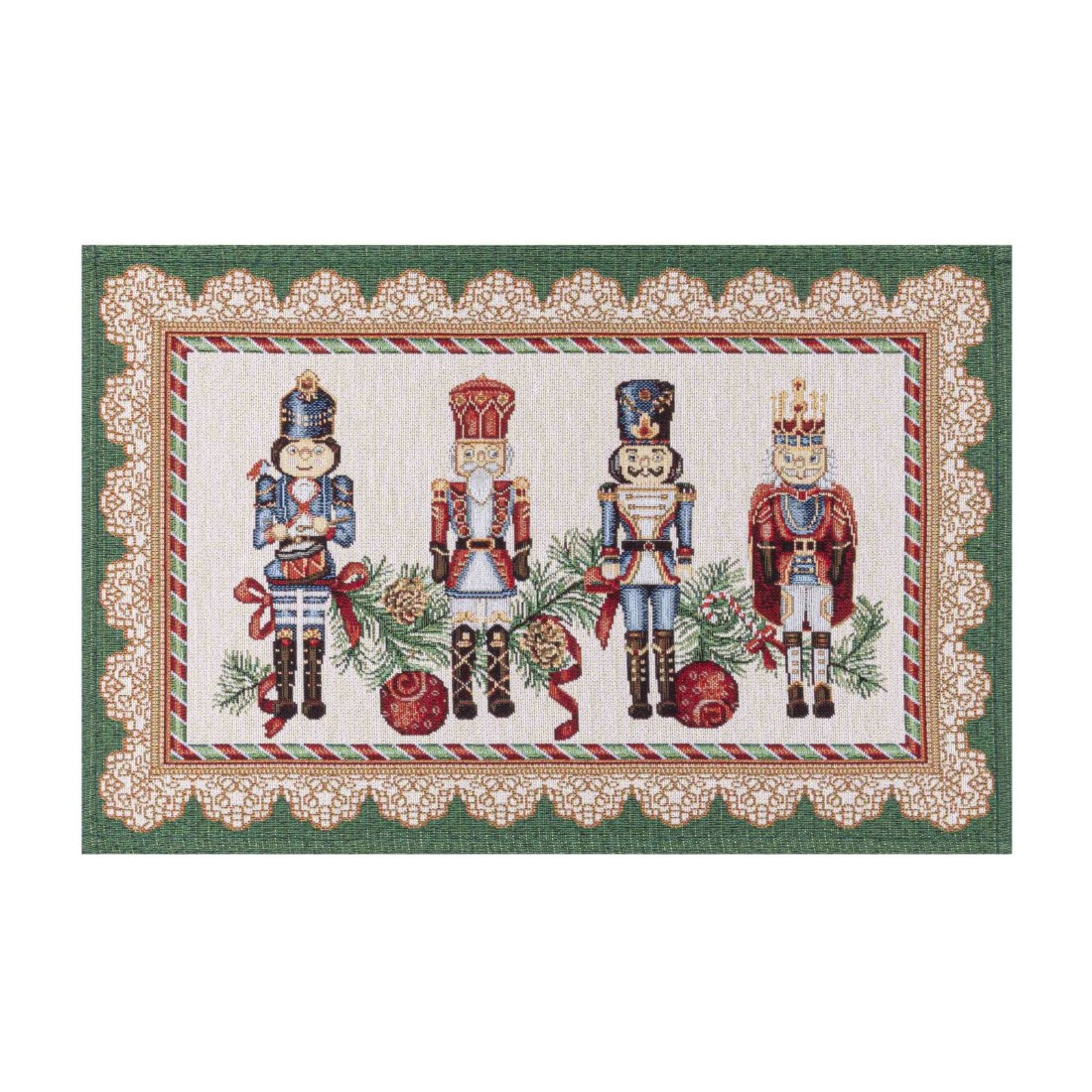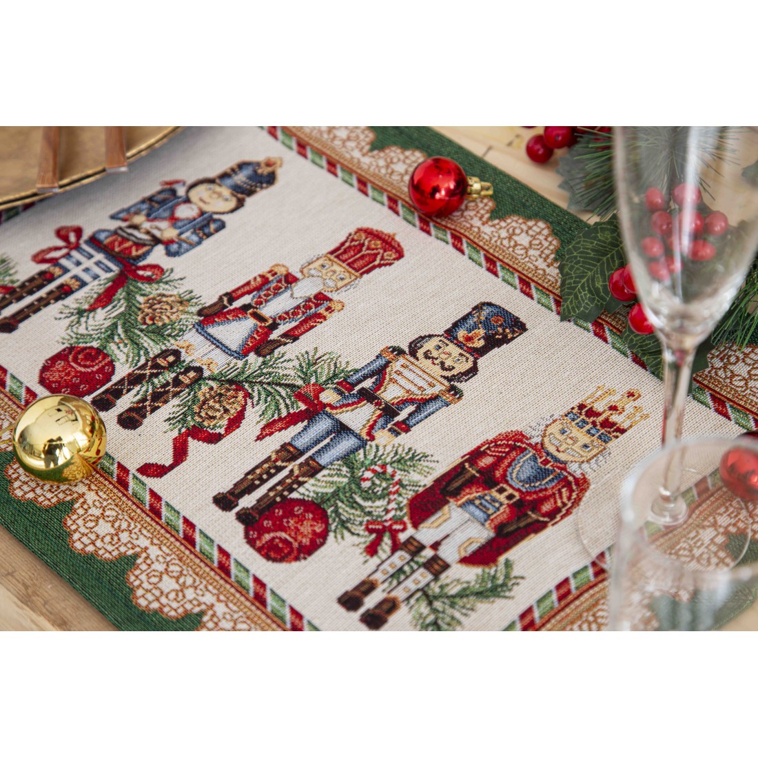 Jacquard placemat set with NUTCRACKER soldiers and Christmas motifs (baubles and pinecones). Beige background with green border.