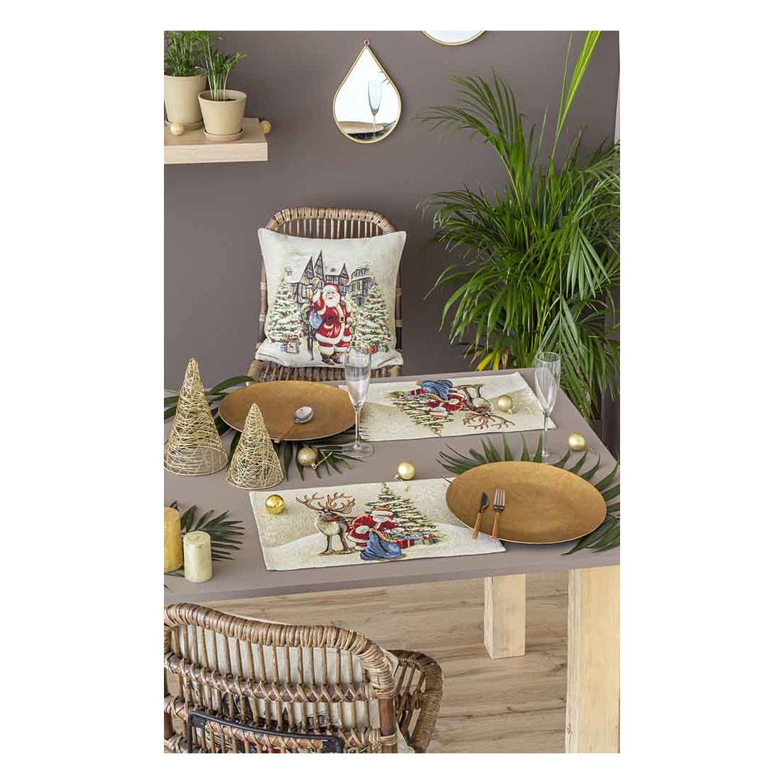 Jacquard placemat set with a central motif of Santa Claus with his reindeer and the Christmas tree. Washable.