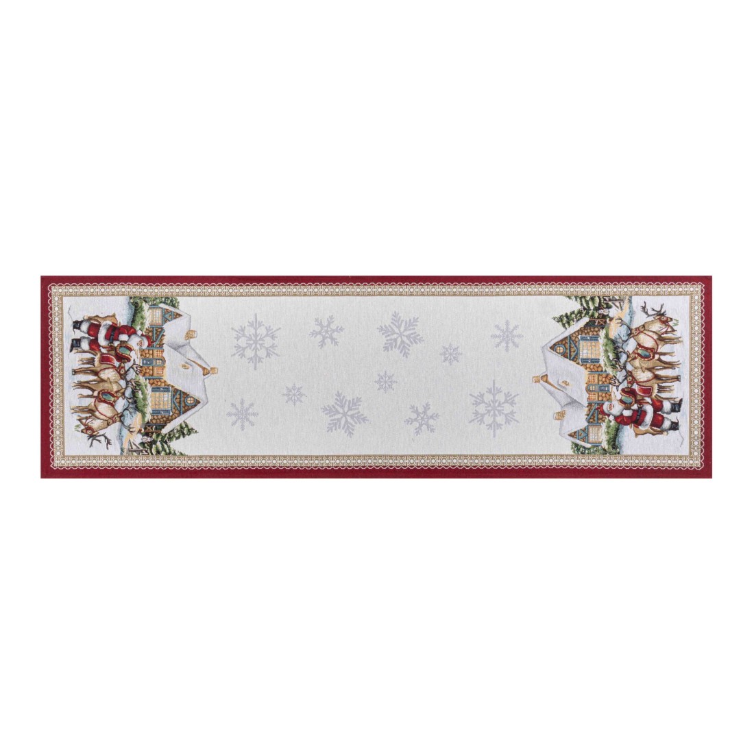 Jacquard table runner with Santa Claus and reindeer in the corner, in front of snowy houses. The background is white with a red border, and in the center there are stars. Washable. FROSTY