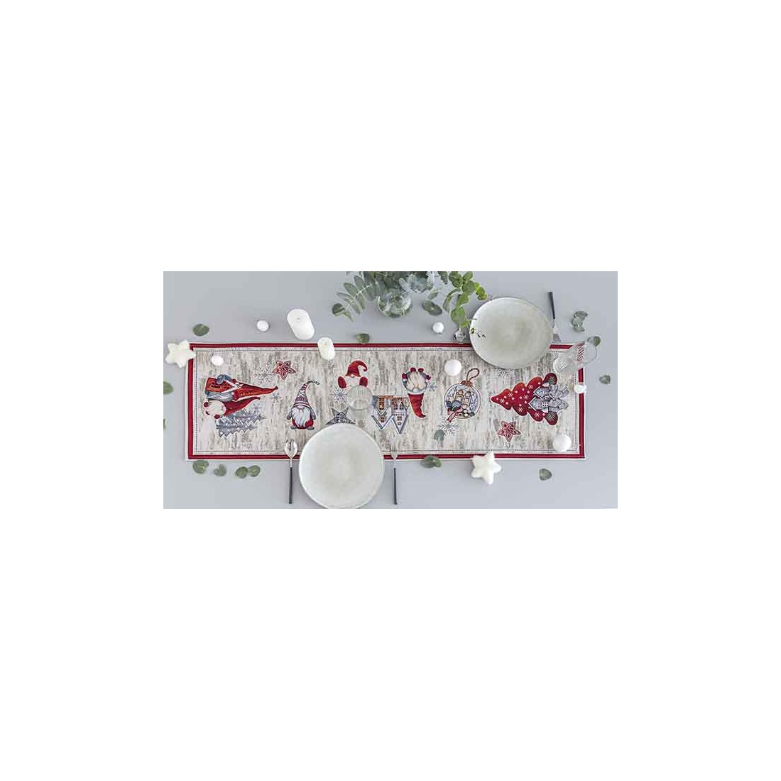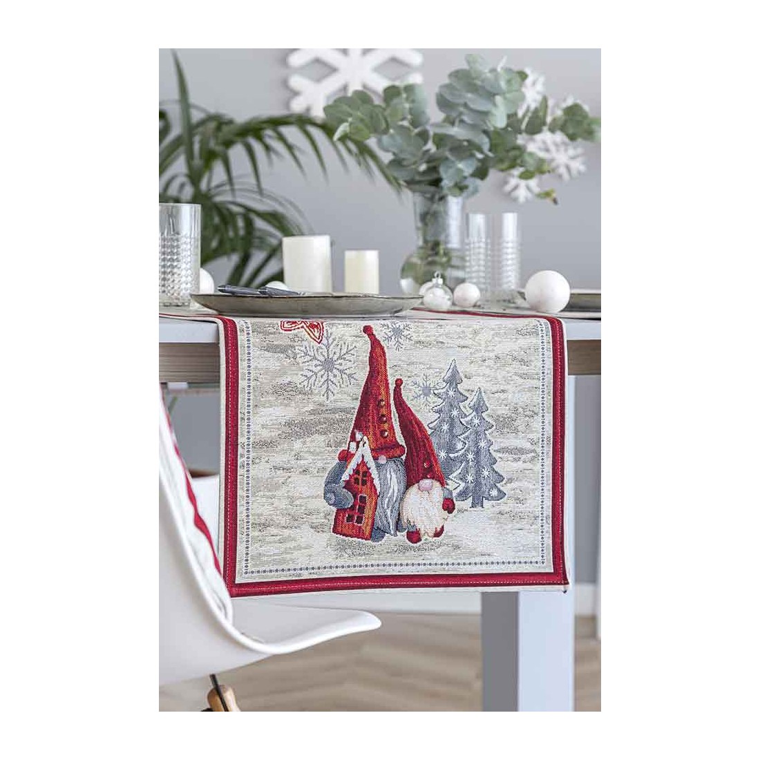 Jacquard table runner with Christmas gnome motifs in grey and red tones. GNOMOS