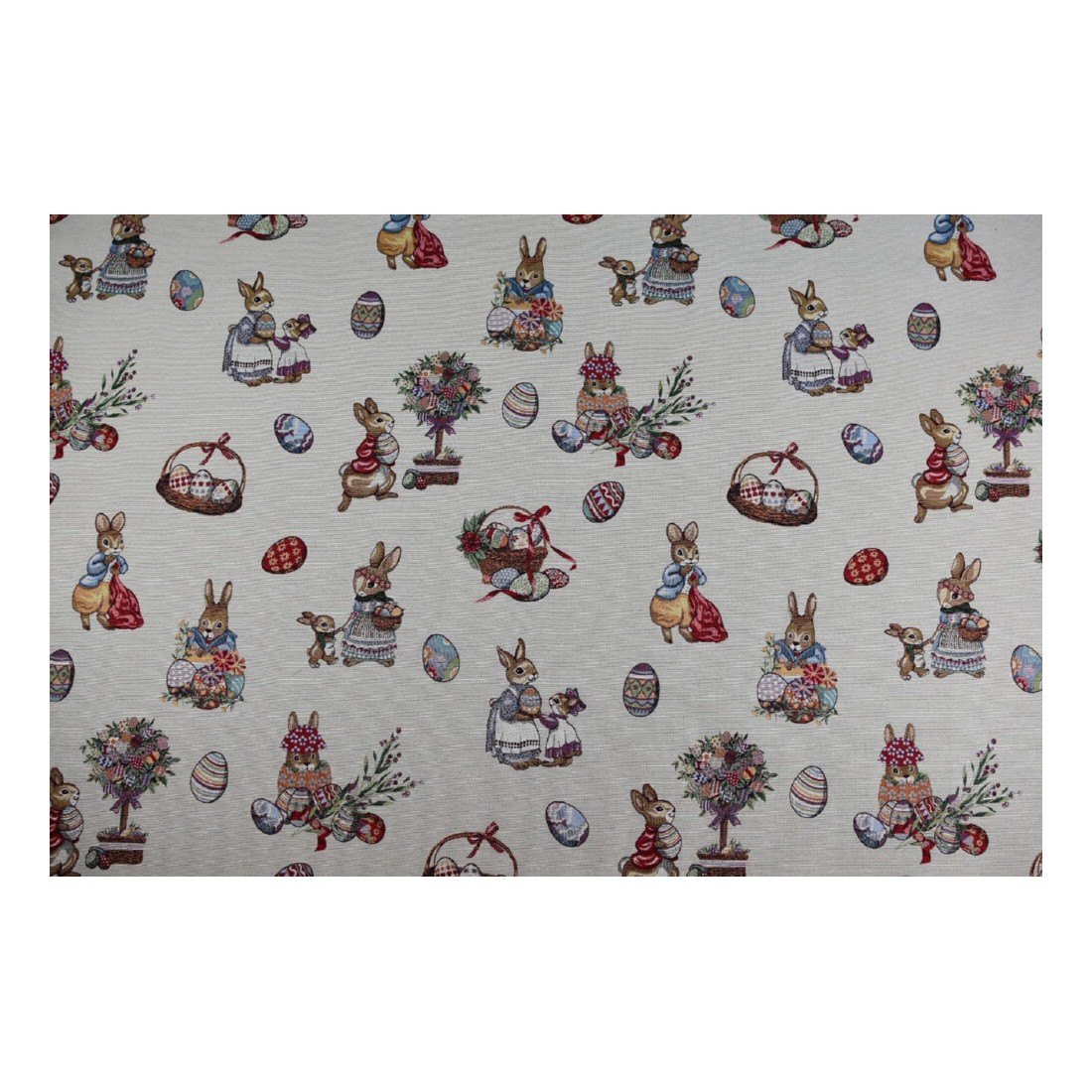 Jacquard fabric with rabbits and Easter eggs. Composition: 60% Polyester, 40% Cotton. Purchase unit: meters of fabric 140 cm wide. Weight: 397 g/m2.