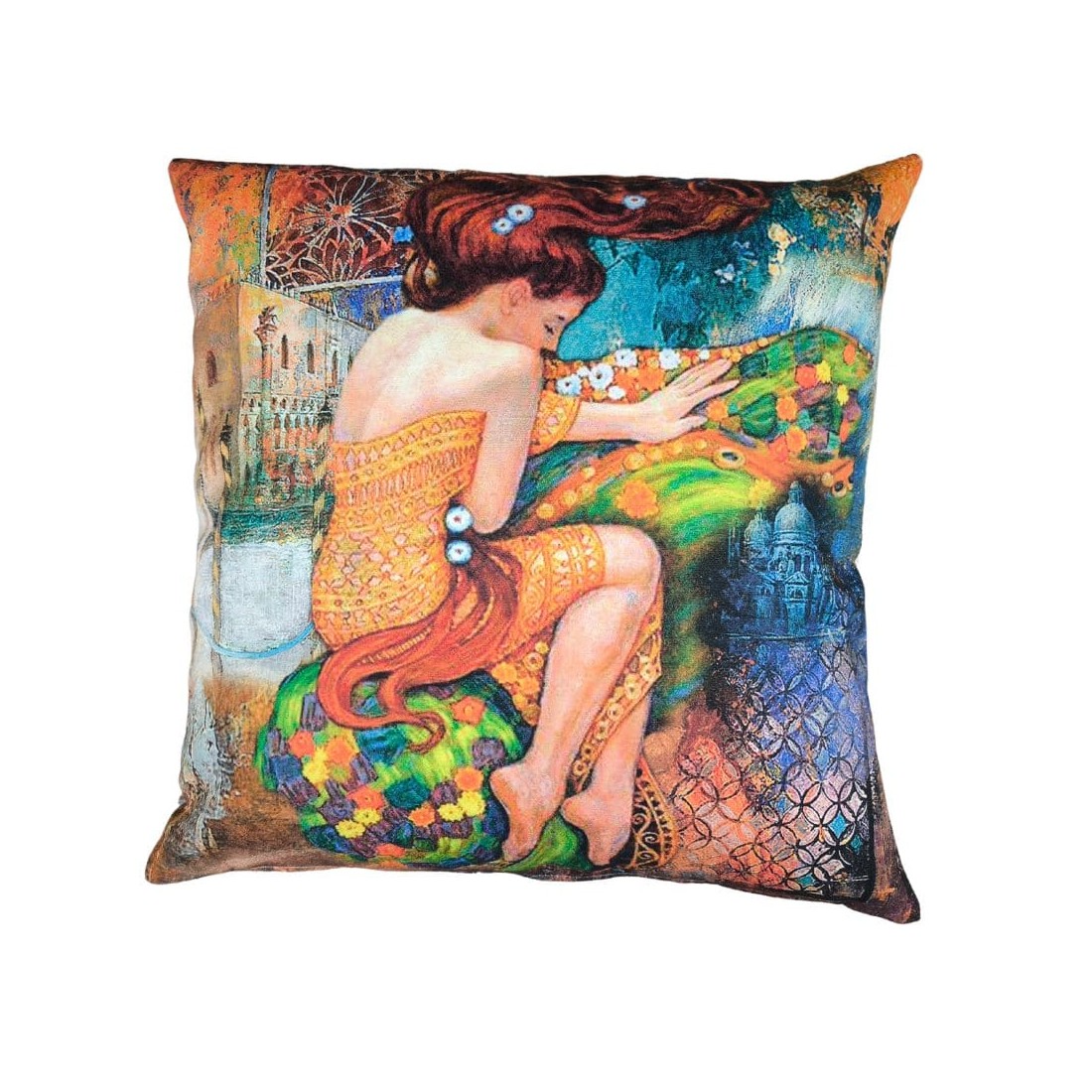 Cushion cover with a woman and background images of Venice in orange, green, and blue colors. Zipper closure. Washable. AURA