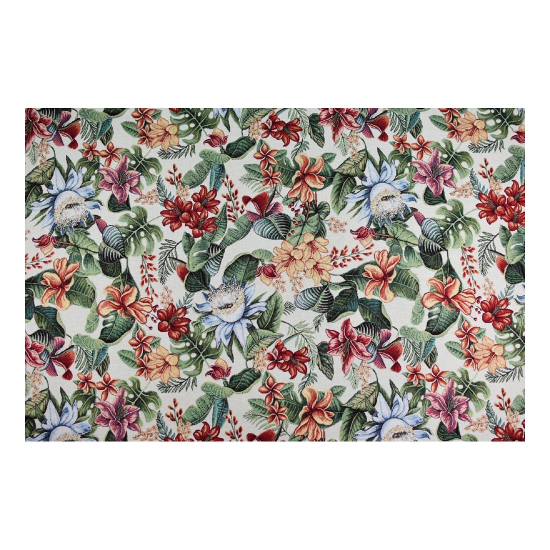 Jacquard fabric with lotus-type flowers in blue, red, and green tones on a beige background. LOTUS. Composition: 60% Polyester, 40% Cotton. Purchase unit: meters of fabric 140 cm wide. Weight: 397 g/m2.