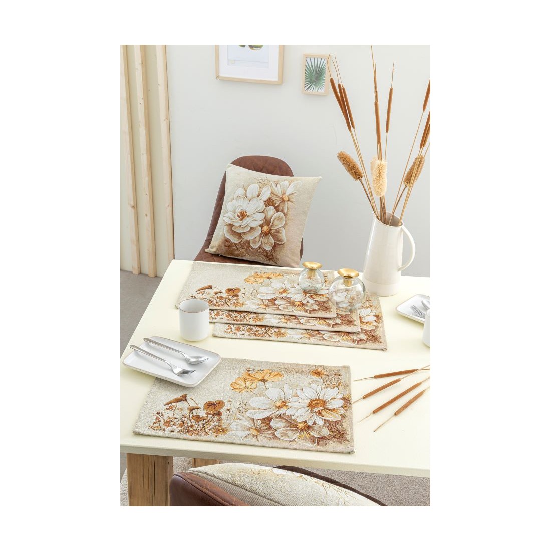 Jacquard placemat set with white and golden flowers on a beige background. NITRA.