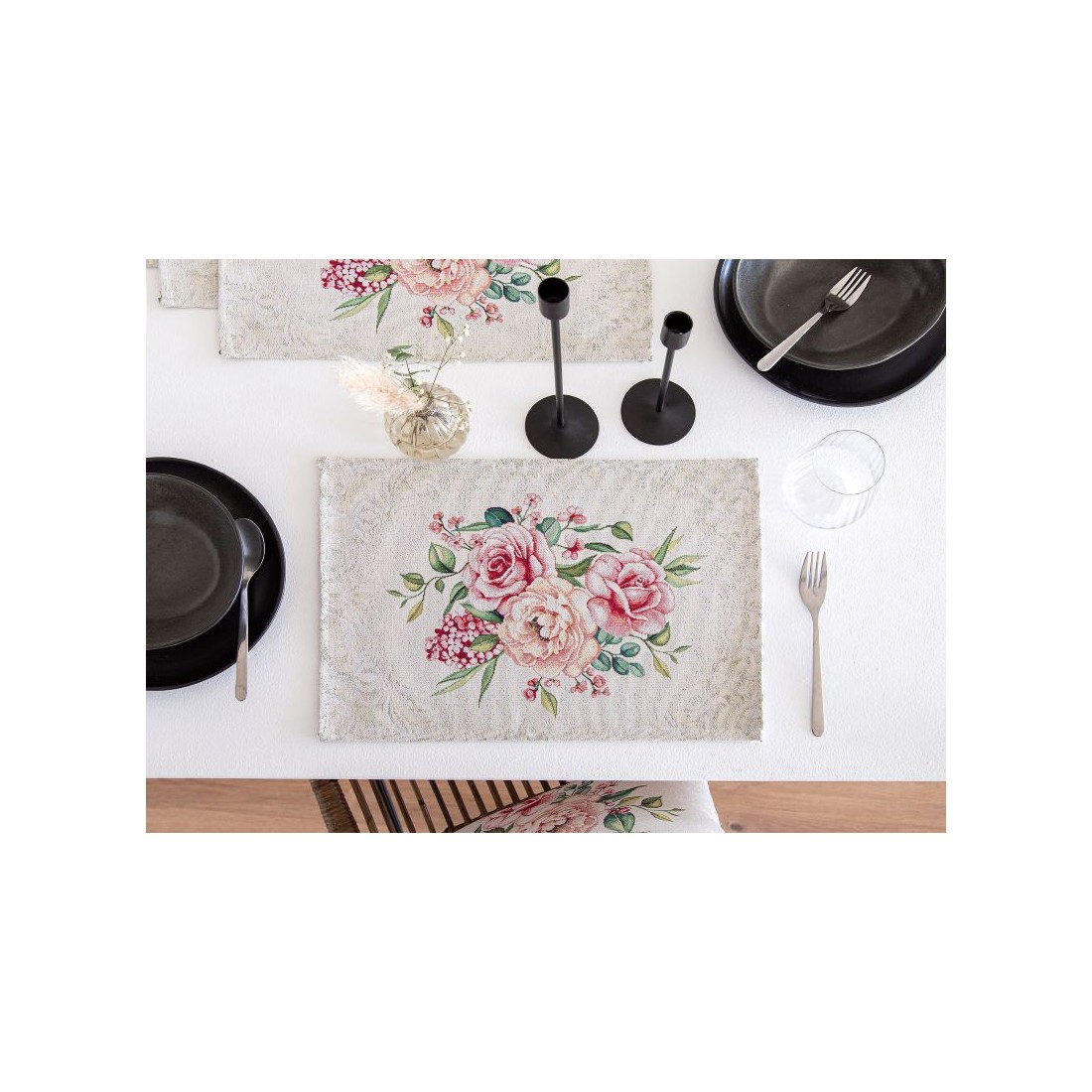 Jacquard placemat set with roses in pastel pink tones, green leaves, and a beige background. PADUA.