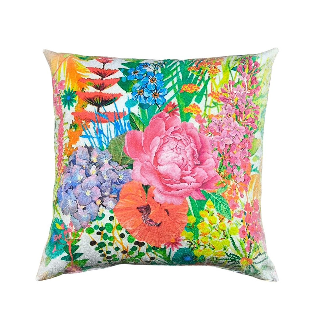 Cushion cover with a variety of flowers such as poppy and hydrangea in shades of red, pink, blue, and green. Zipper closure. Washable. DEMETER