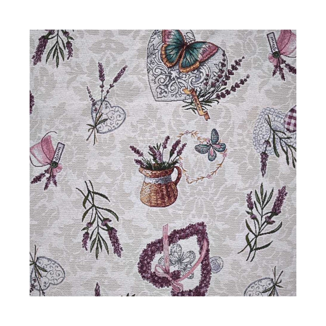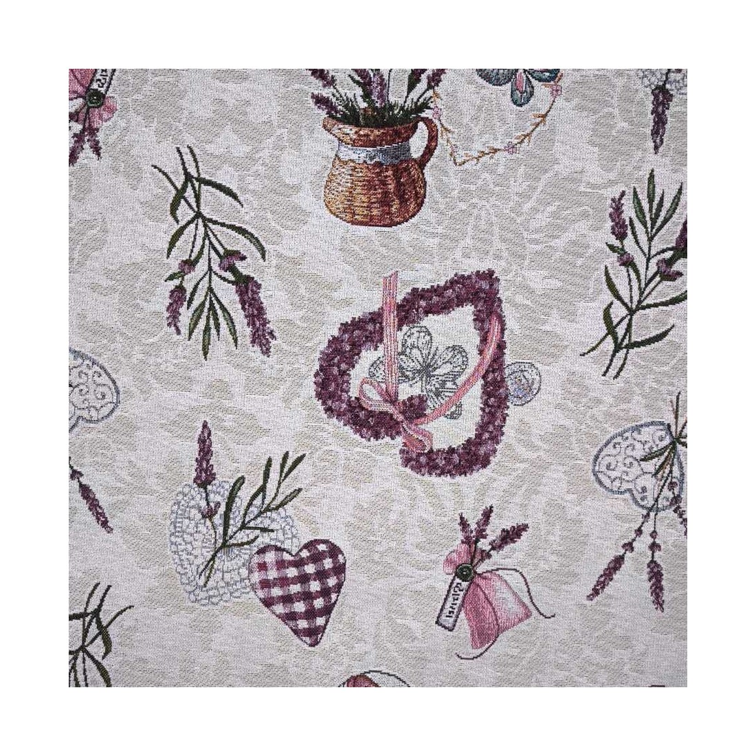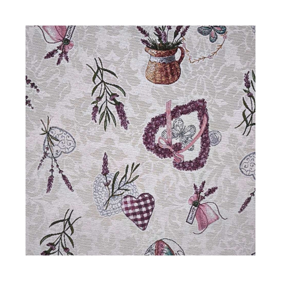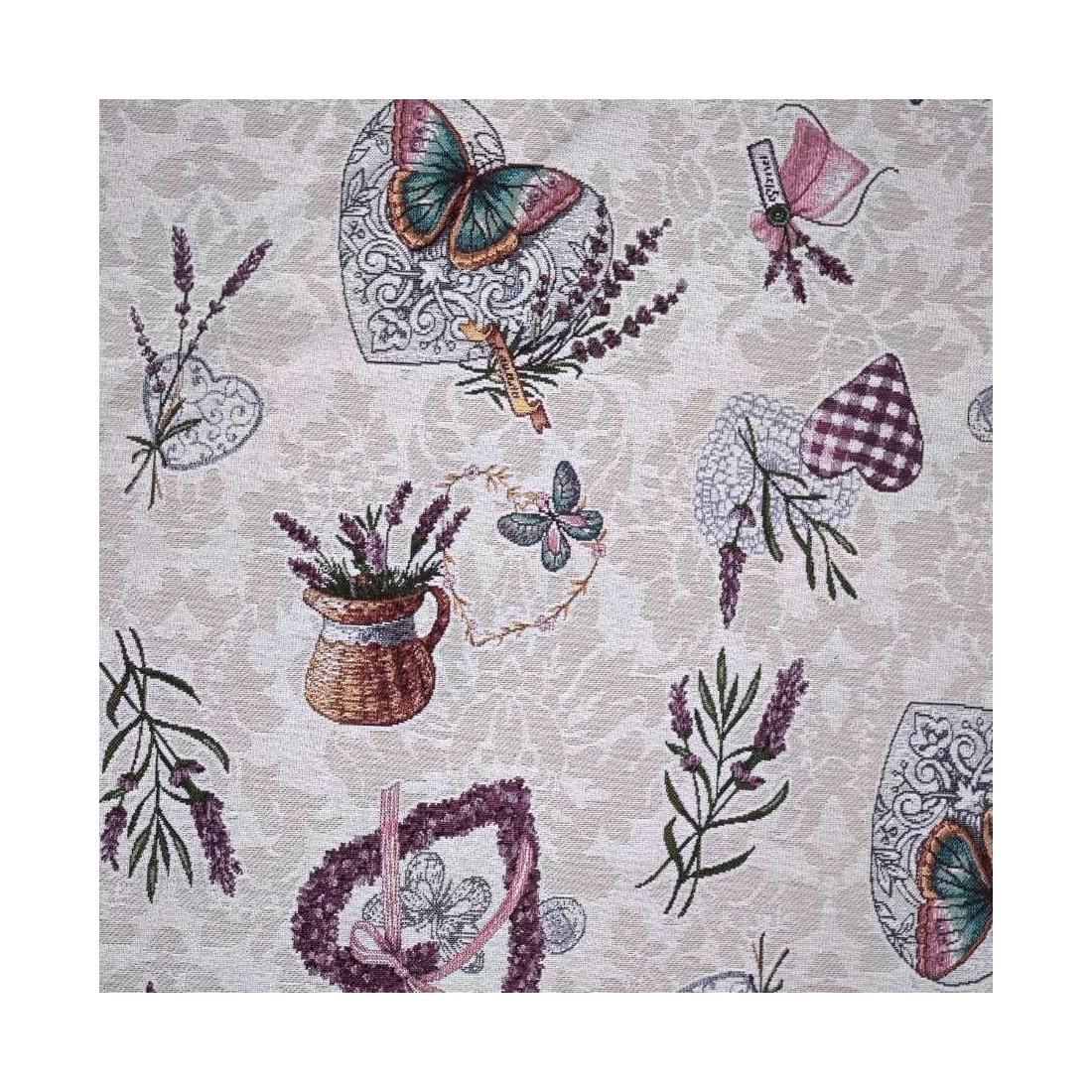 Jacquard fabric by the meter inspired by the fields of Provence with lavender flowers, vases, and hearts in purple tones. The shades of violet and fresh green will combine perfectly with pastel tones or fabrics with subtle floral motifs. White background. LAVANDER.