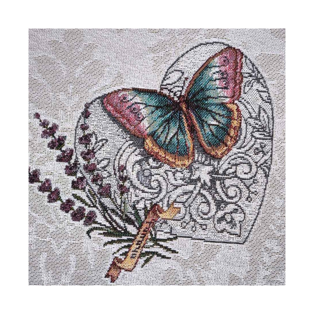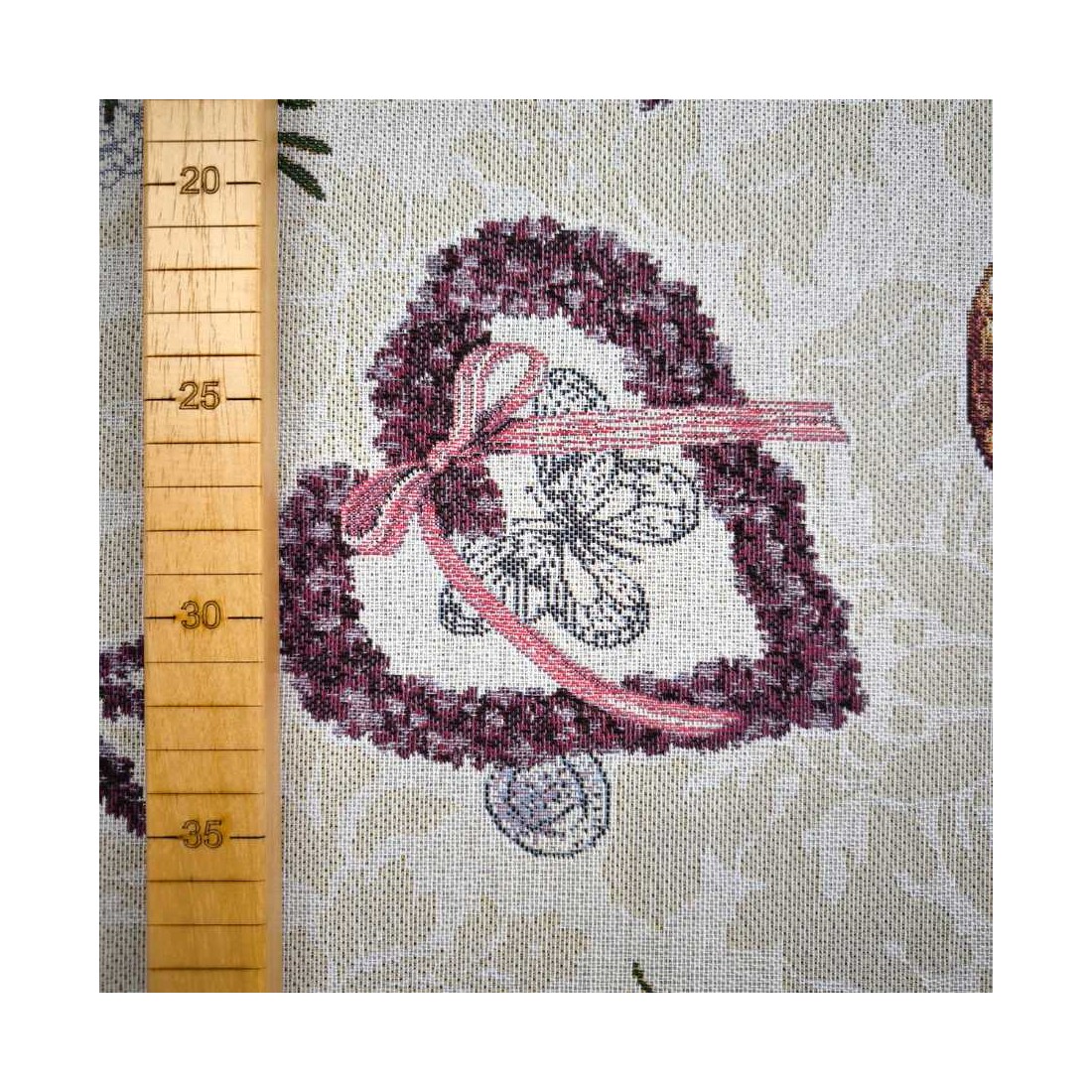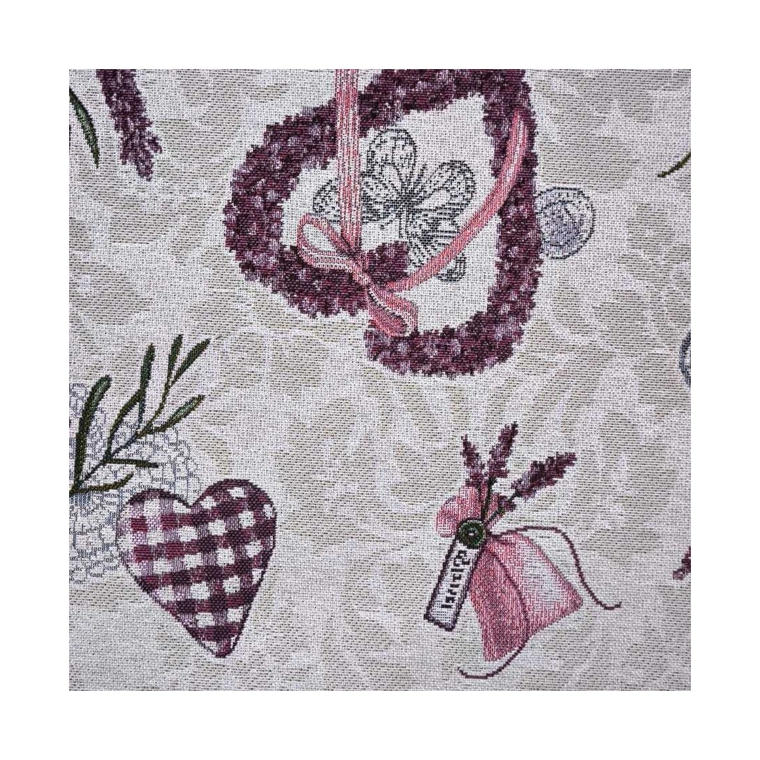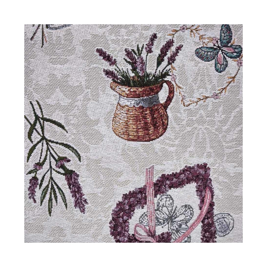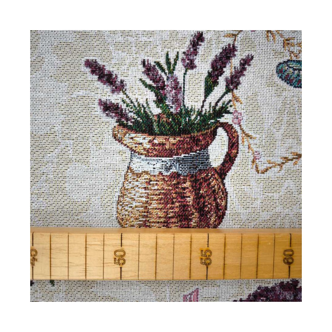 Jacquard fabric by the meter inspired by the fields of Provence with lavender flowers, vases, and hearts in purple tones. The shades of violet and fresh green will combine perfectly with pastel tones or fabrics with subtle floral motifs. White background. LAVANDER.