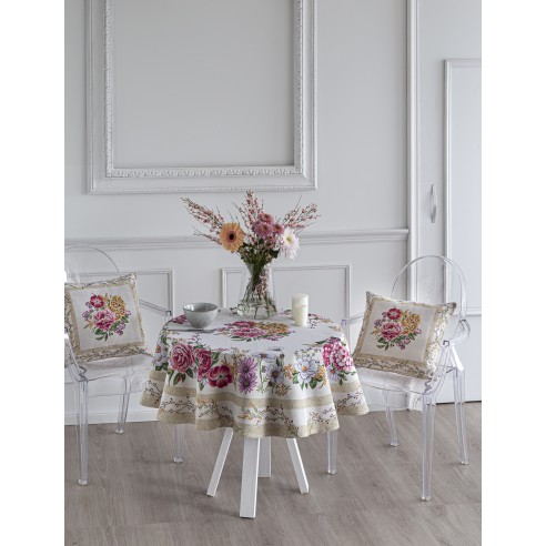 Jacquard tablecloth with pink and yellow flowers on a beige background. Washable. XANA.