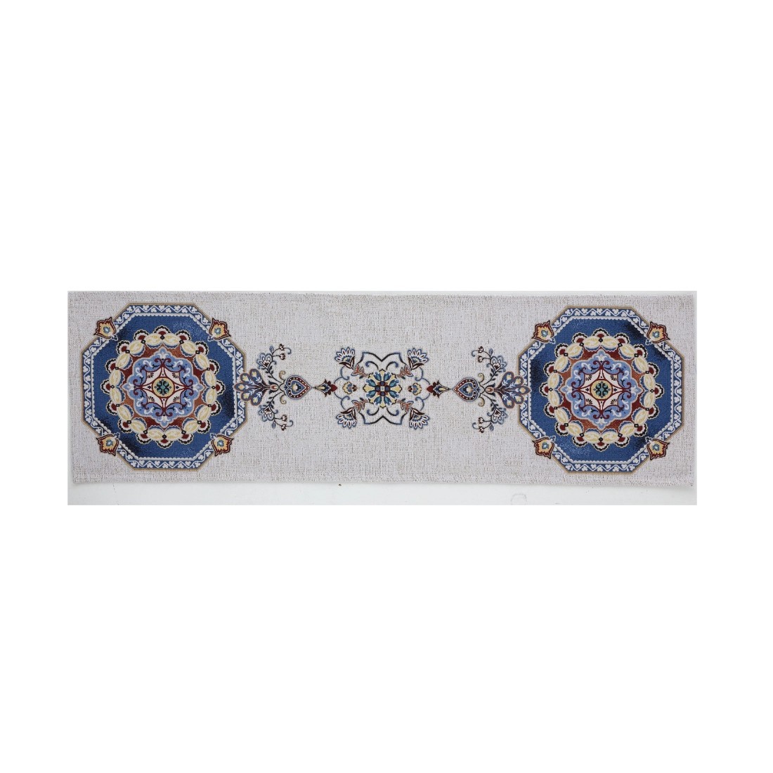 This Mediterranean table runner stands out for its symmetrical composition with ornamental medallions at each end and a refined central motif that adds visual continuity. Its elongated structure enhances the table without overwhelming it, making it suitable for both classic and contemporary interiors.