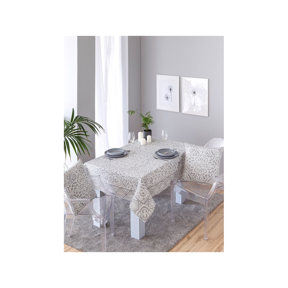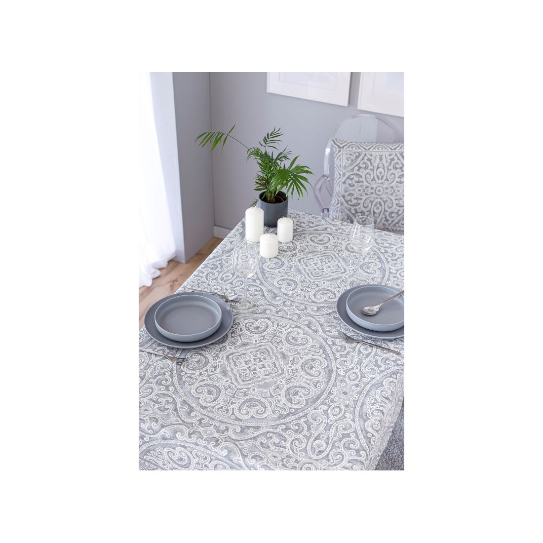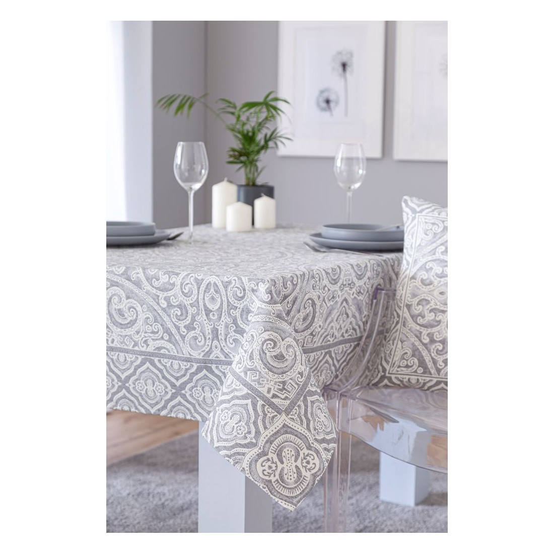 Jacquard tablecloth with geometric motifs in grey tones. Washable.