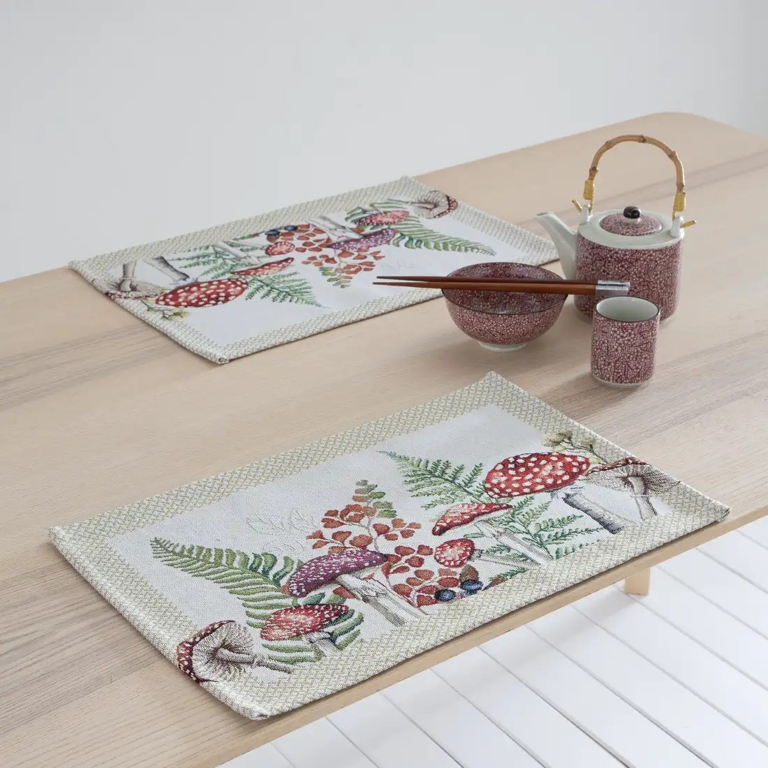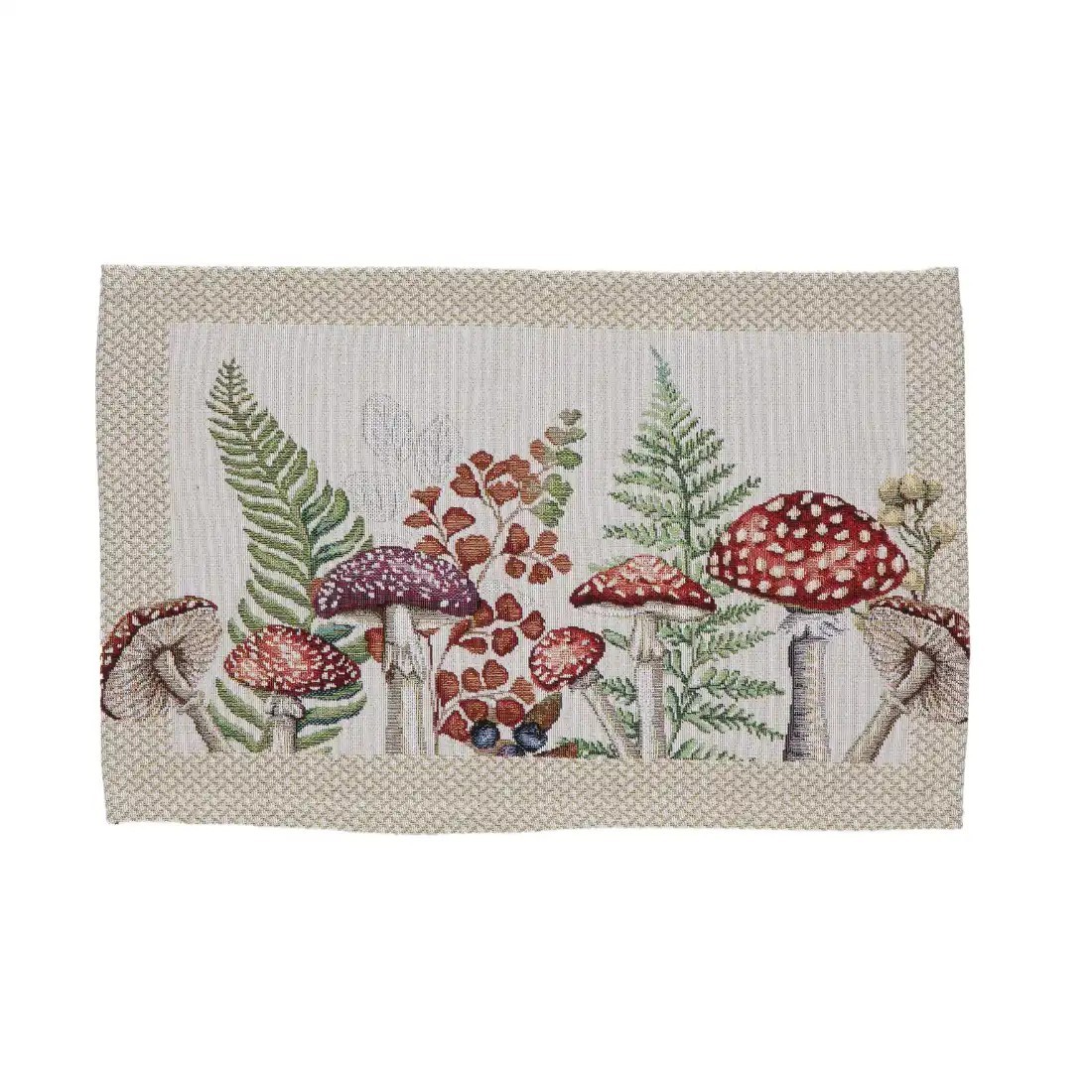 Camino de mesa Jacquard 40x135 cm en fondo beige con diseño botánico con flores y setas...