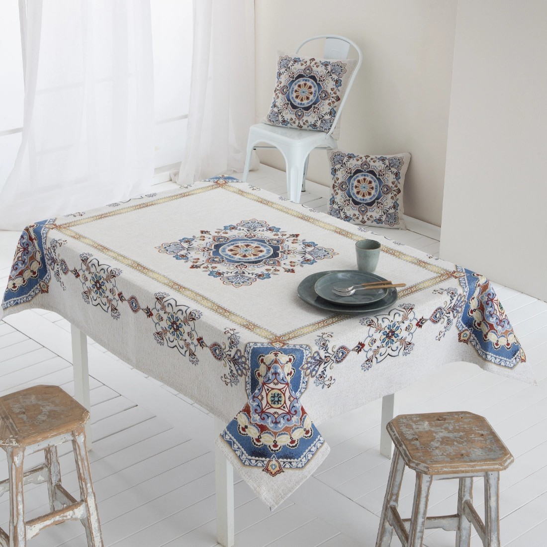 This tablecloth stands out for its symmetrical composition and central ornamental medallion. The design is harmoniously structured, creating an elegant focal point that adds character without overwhelming the table. Decorative details frame the piece with visual balance, achieving a refined aesthetic that complements both classic and contemporary interiors. Ideal for dressing the dining space with personality, it brings brightness and distinction to everyday meals and special gatherings alike.