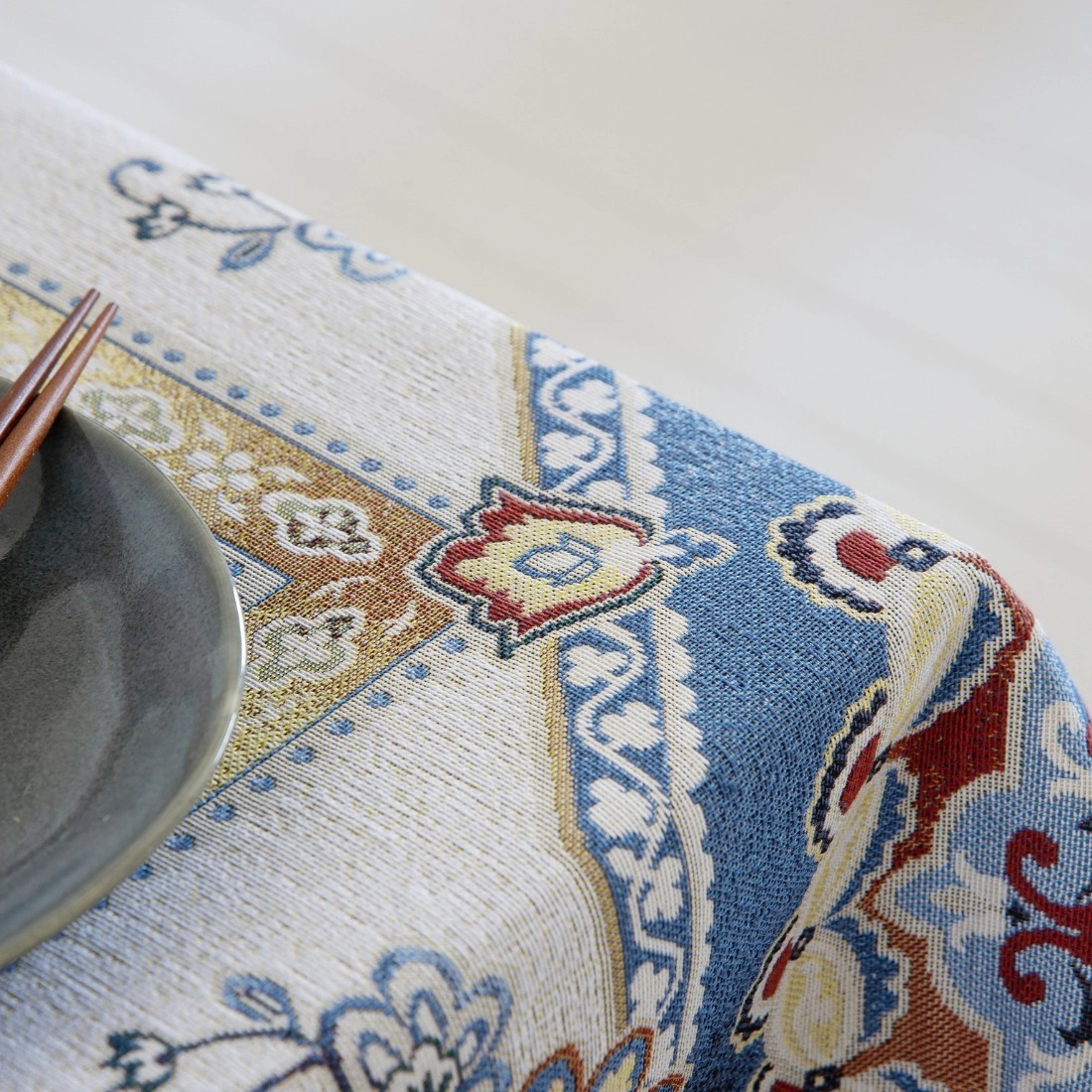 The Mediterranean tablecloth is crafted in jacquard fabric, a technique in which the design is not printed but woven directly into the structure of the material. This process creates a subtle relief and rich texture that enhances every ornamental detail with depth and definition.