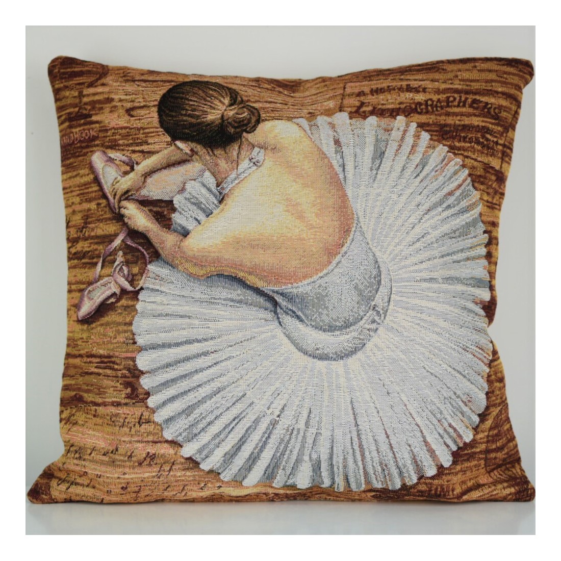 Jacquard cushion cover with a ballerina wearing a ballet tutu on a wooden floor. Zipper closure. ODETTE