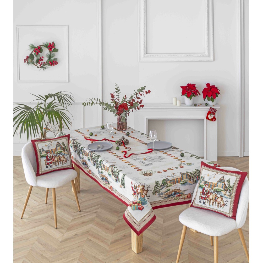 Jacquard tablecloth with Santa Claus in the snow with his reindeer and snowy houses. The center is framed with Christmas baubles and pinecones, and in the middle Santa Claus with his sleigh and reindeer. Washable.