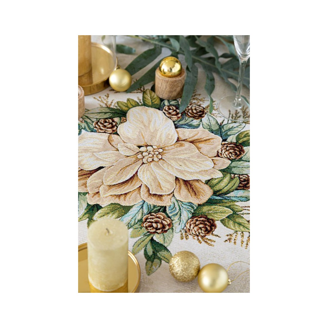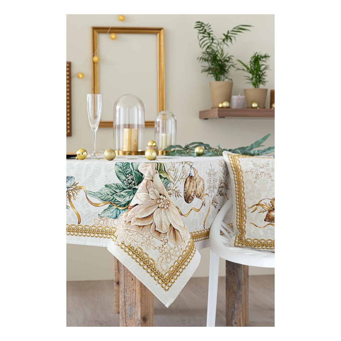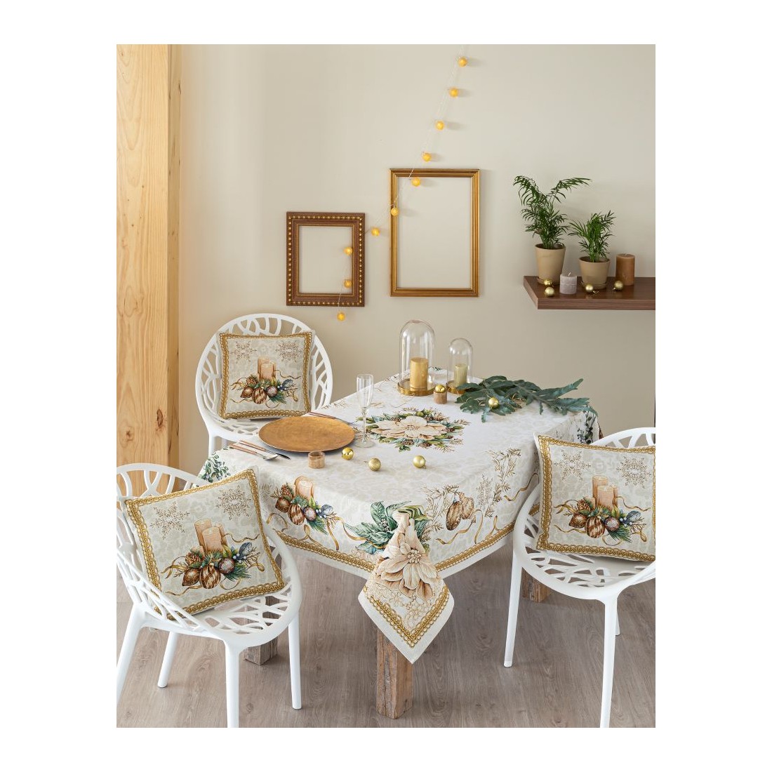 Jacquard tablecloth with Christmas motifs (baubles, pinecones, candles, and flower). In golden and brown tones. A very elegant tablecloth thanks to the shiny touch provided by the lurex. Washable.