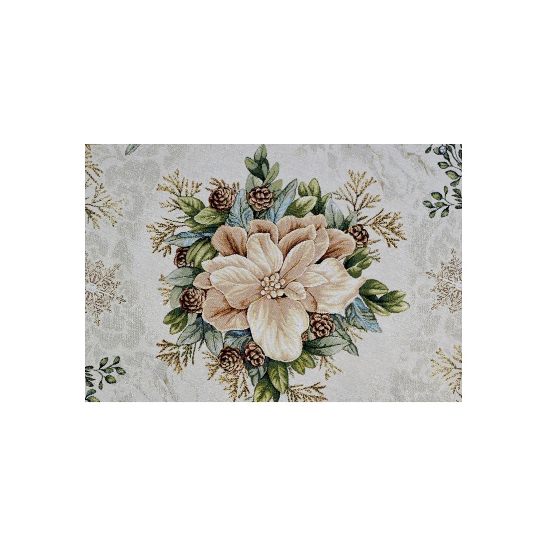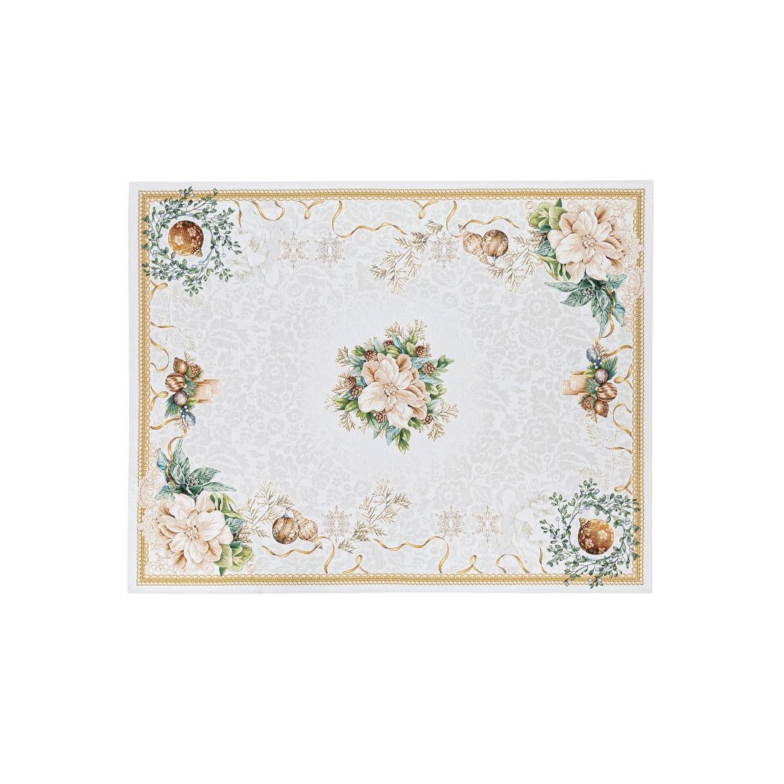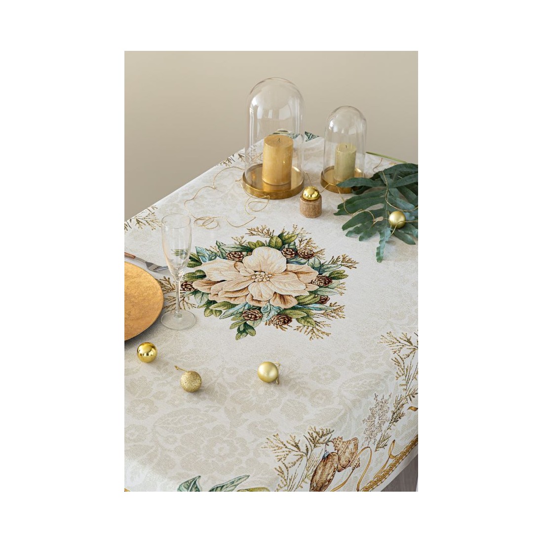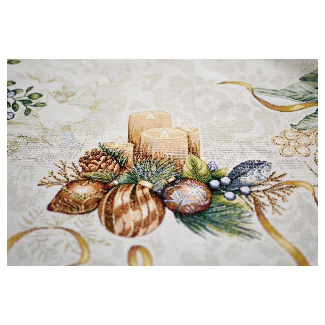 Jacquard tablecloth with Christmas motifs (baubles, pinecones, candles, and flower). In golden and brown tones. A very elegant tablecloth thanks to the shiny touch provided by the lurex. Washable.