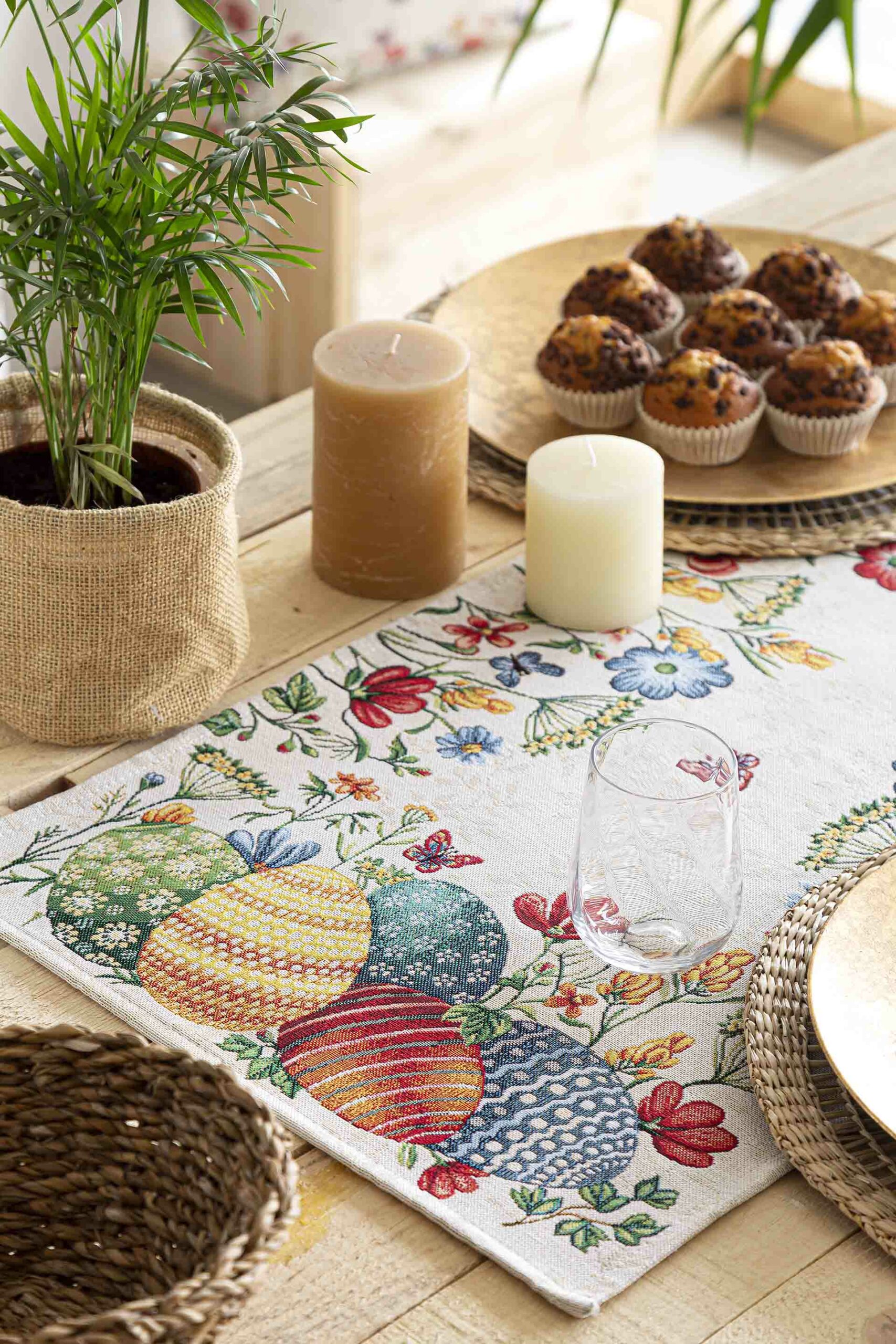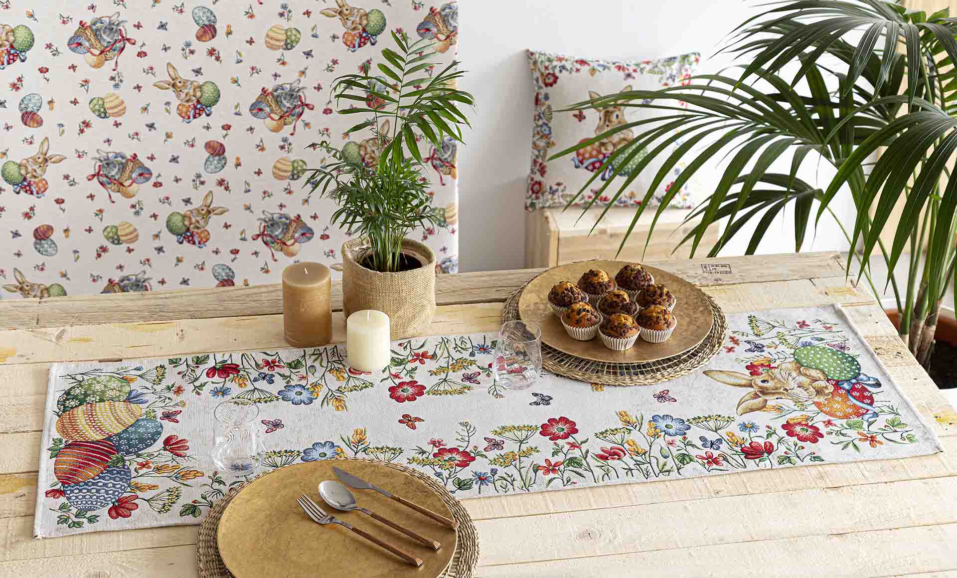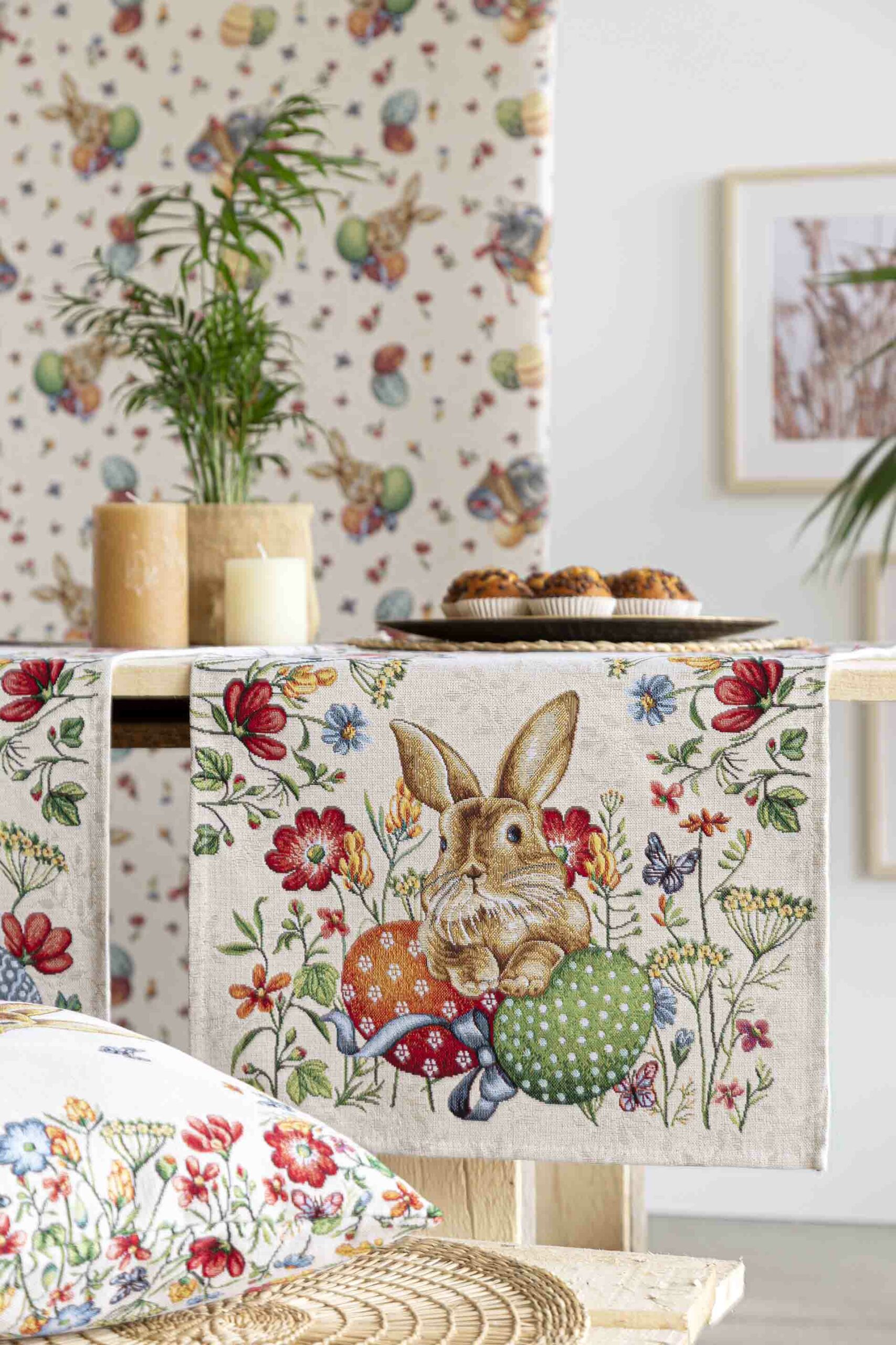 Jacquard woven table runner with rabbit and traditional Easter eggs. The border is made up of small spring flowers and butterflies. Beige background. Composition: 40% Polyester, 40% Cotton and 20% Acrylic. EGGS