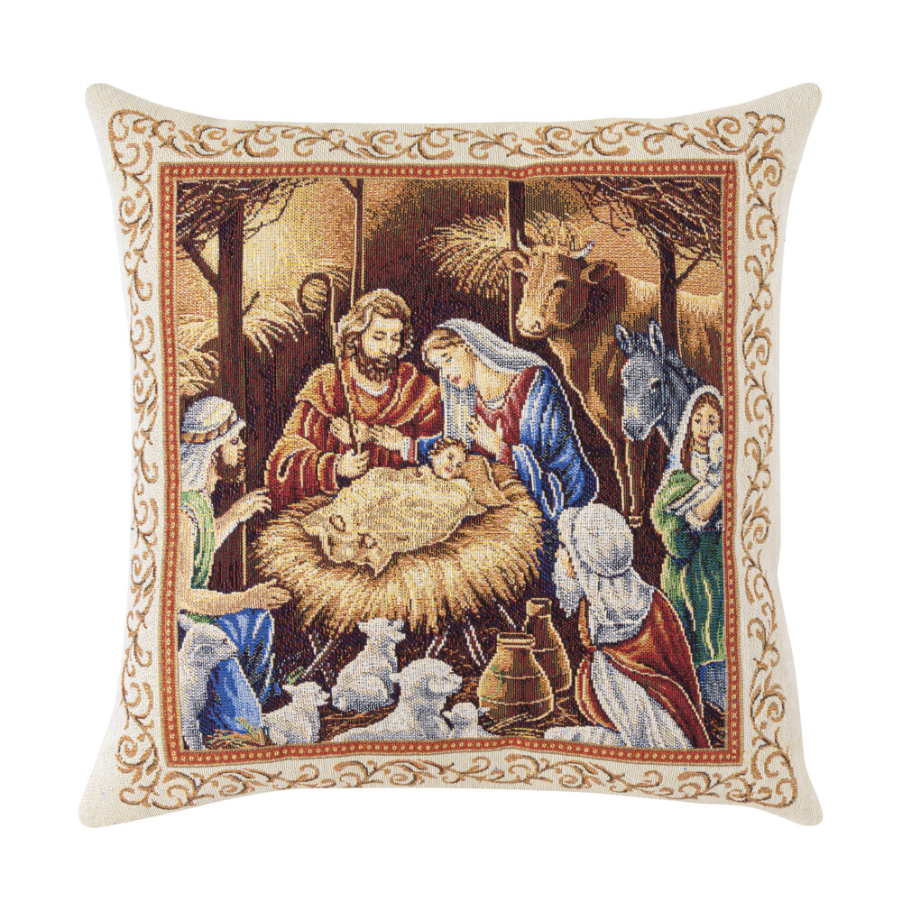 Jacquard cushion cover with the image of the birth of Jesus and the adoration of the shepherds on a beige background and golden ornamental border. Zip closure