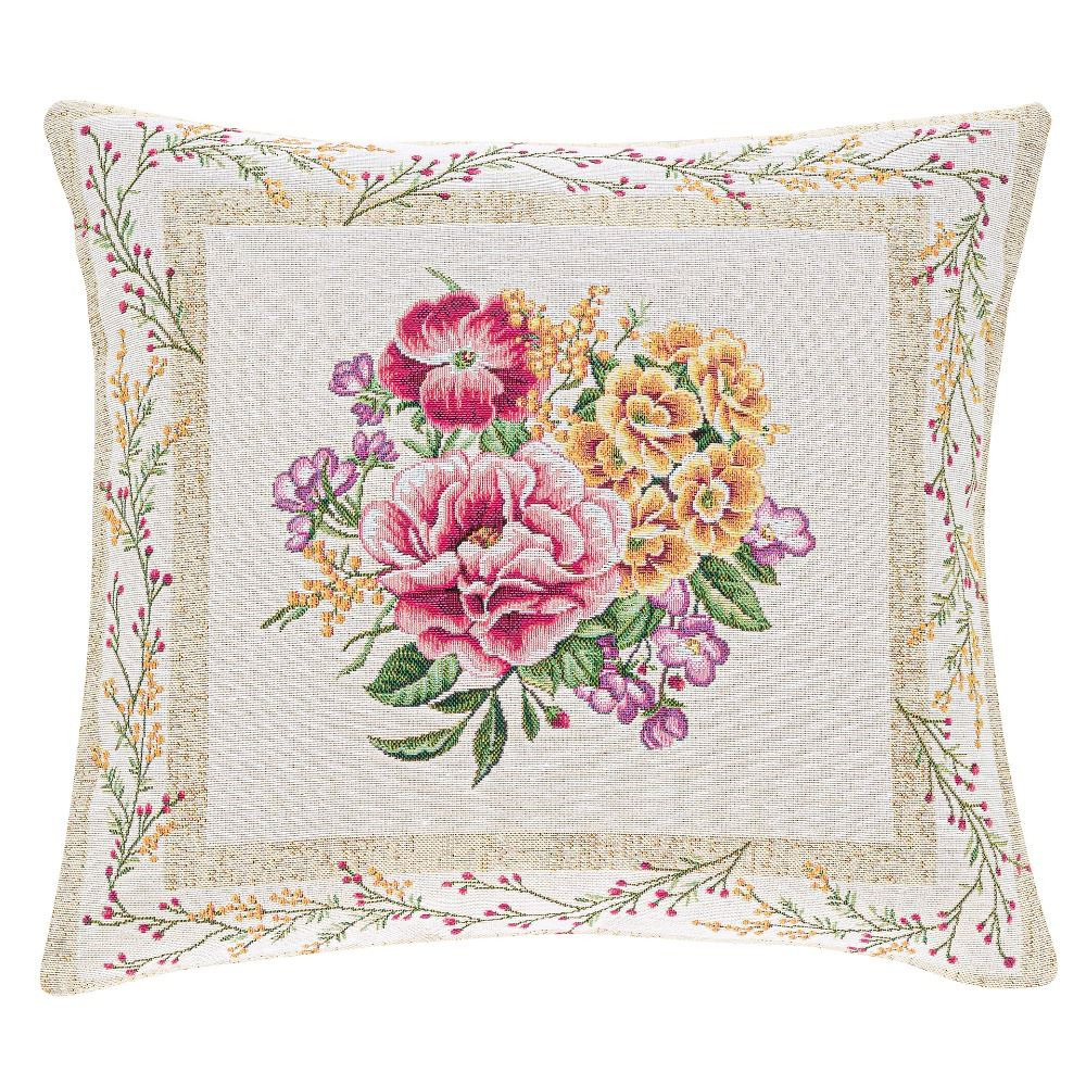 Jaquard cushion cover with a central bouquet of elegant pink flowers and a beige background. Zip closure.