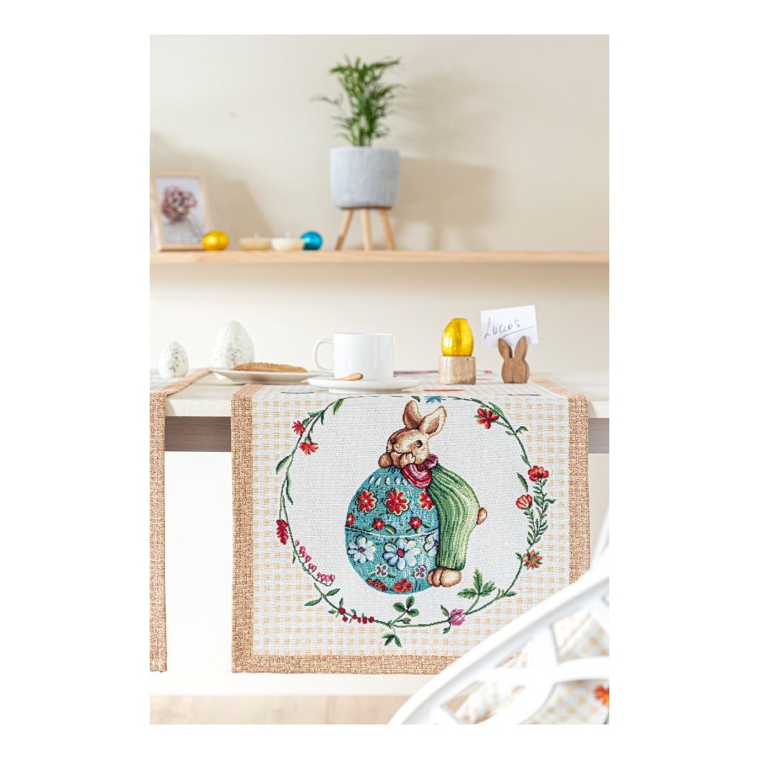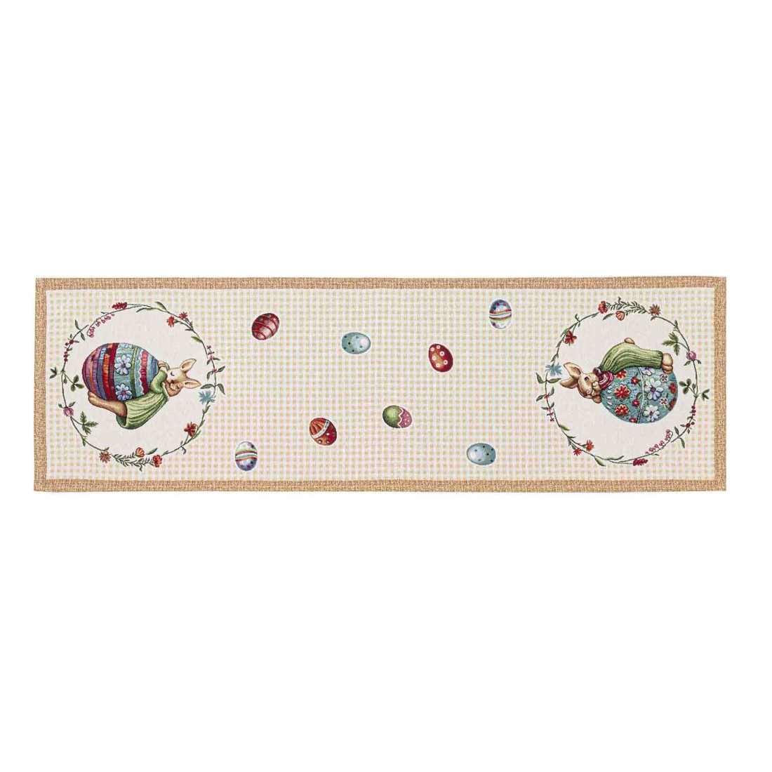 Jacquard table runner with cheerful rabbits and traditional Easter eggs. With beige background. Washable. HOP
