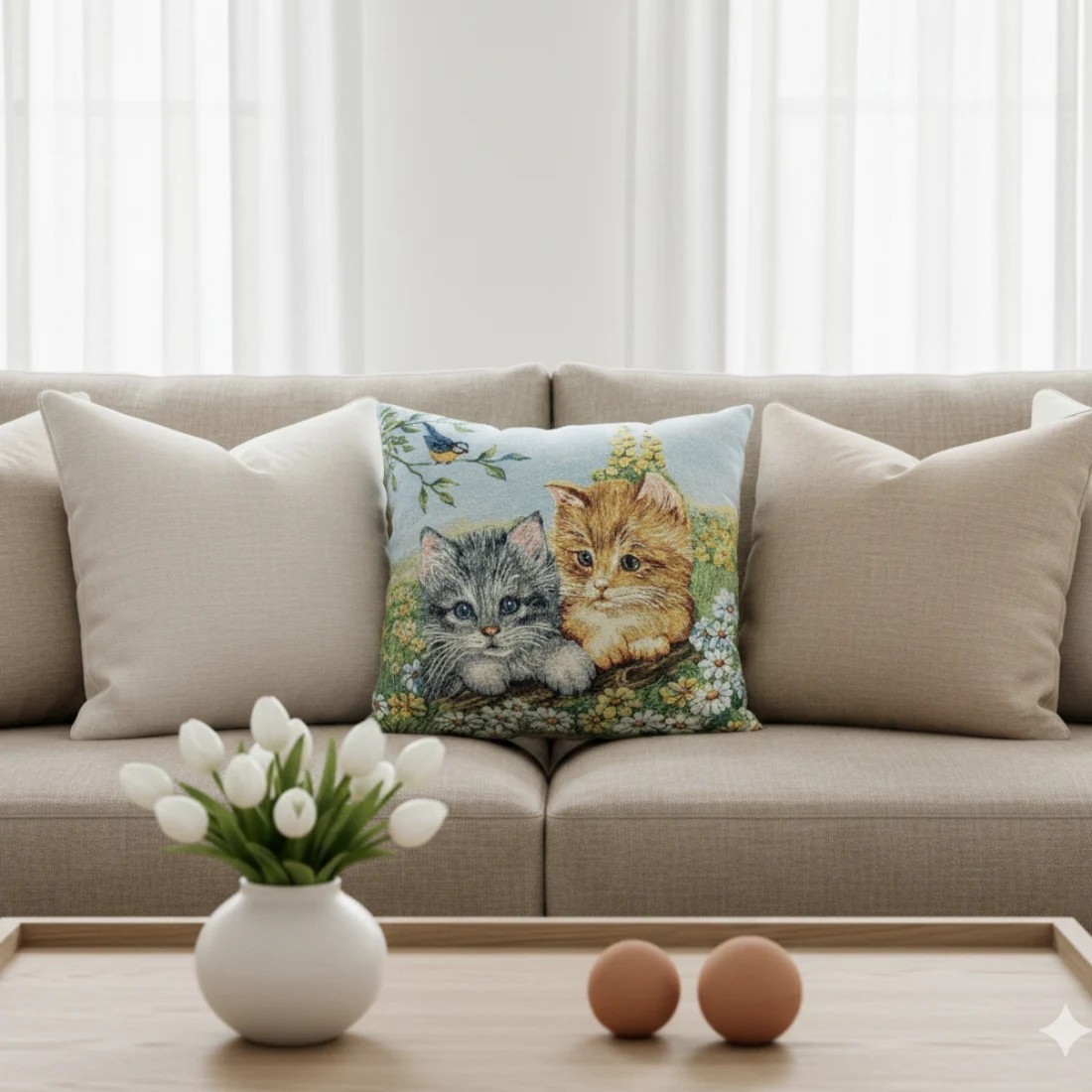 The Gatitos en el jardín decorative cushion brings a sweet and charming touch to any space in the home. Its design features two adorable kittens surrounded by wildflowers and nature, accompanied by a small bird perched on a branch, creating a delicate and tender scene that conveys calm and harmony. It is also a perfect gift option for those who adore cats and decorative details inspired by animals