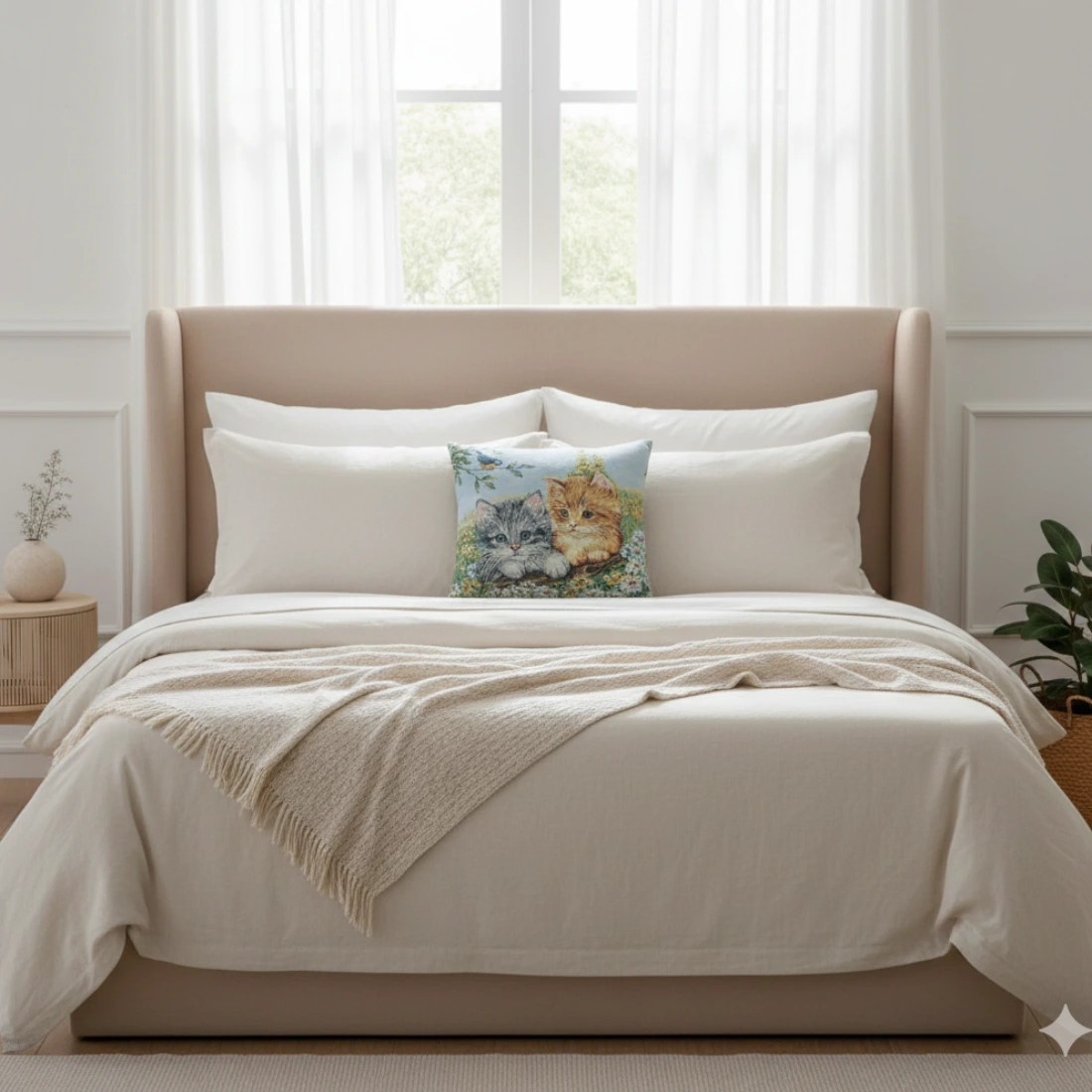 Its Jacquard weaving construction ensures that the details of the kittens’ fur and the richness of the floral elements maintain their definition and color over time. This makes it an exceptional decorative piece for those who appreciate a soft countryside style, offering a perfect combination of artisanal durability and cozy home warmth.