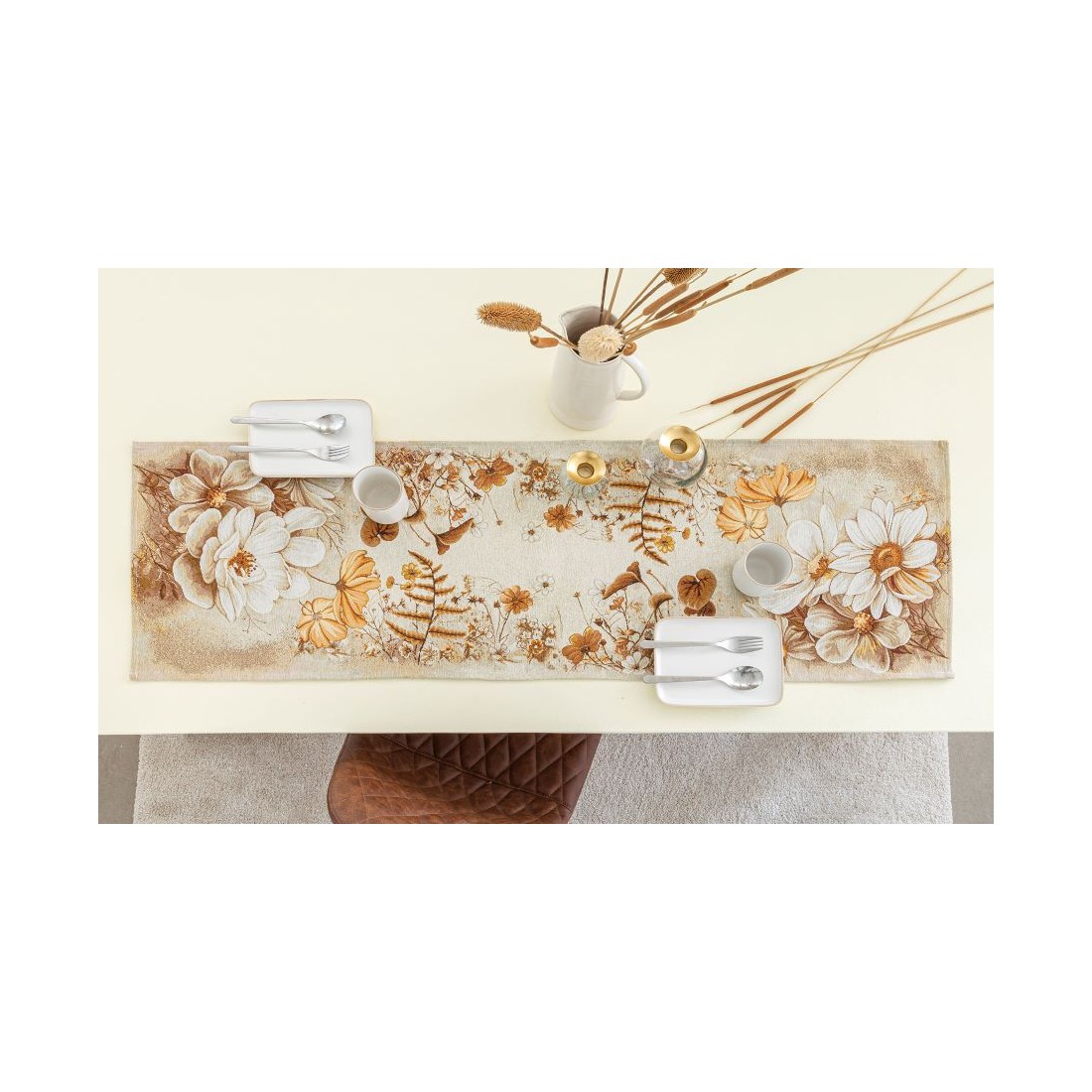 Camino de mesa de tejido Jacquard con flores blancas y doradas con fondo beig NITRA.