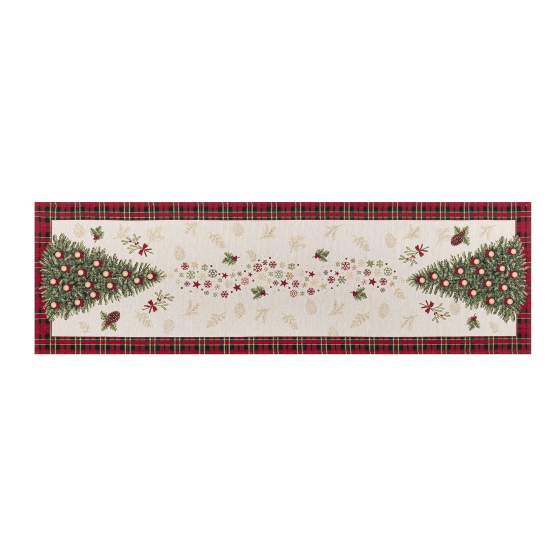 Camino de mesa de tejido jacquard con Arboles de Navidad en las esquinas y con borde de cuadros negro y rojo. Destacan los tonos beig de su fondo con el color verde y rojo, y unos destellos de brillo dorado. Lavable. SAPIN