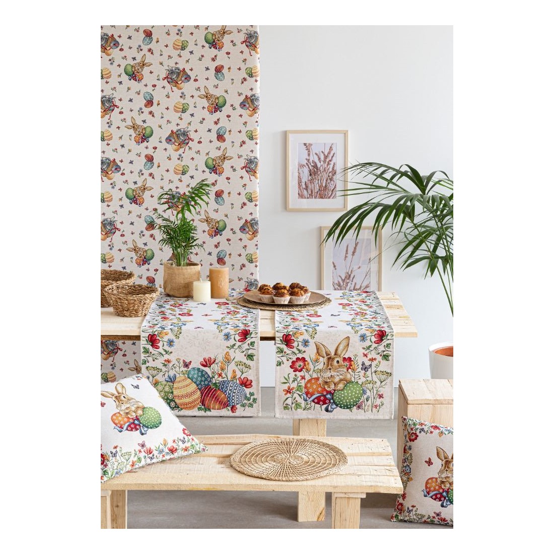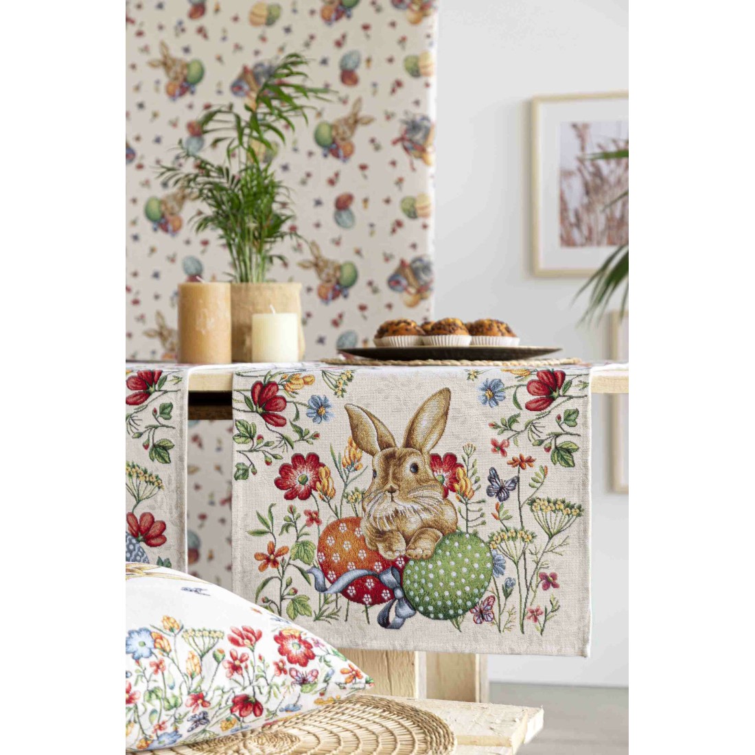 Camino de mesa de tejido jacquard con conejo y los tradicionales huevos de pascua. El borde está formado por pequeñas flores primaverales y mariposas. Fondo beig. Lavable. EGGS