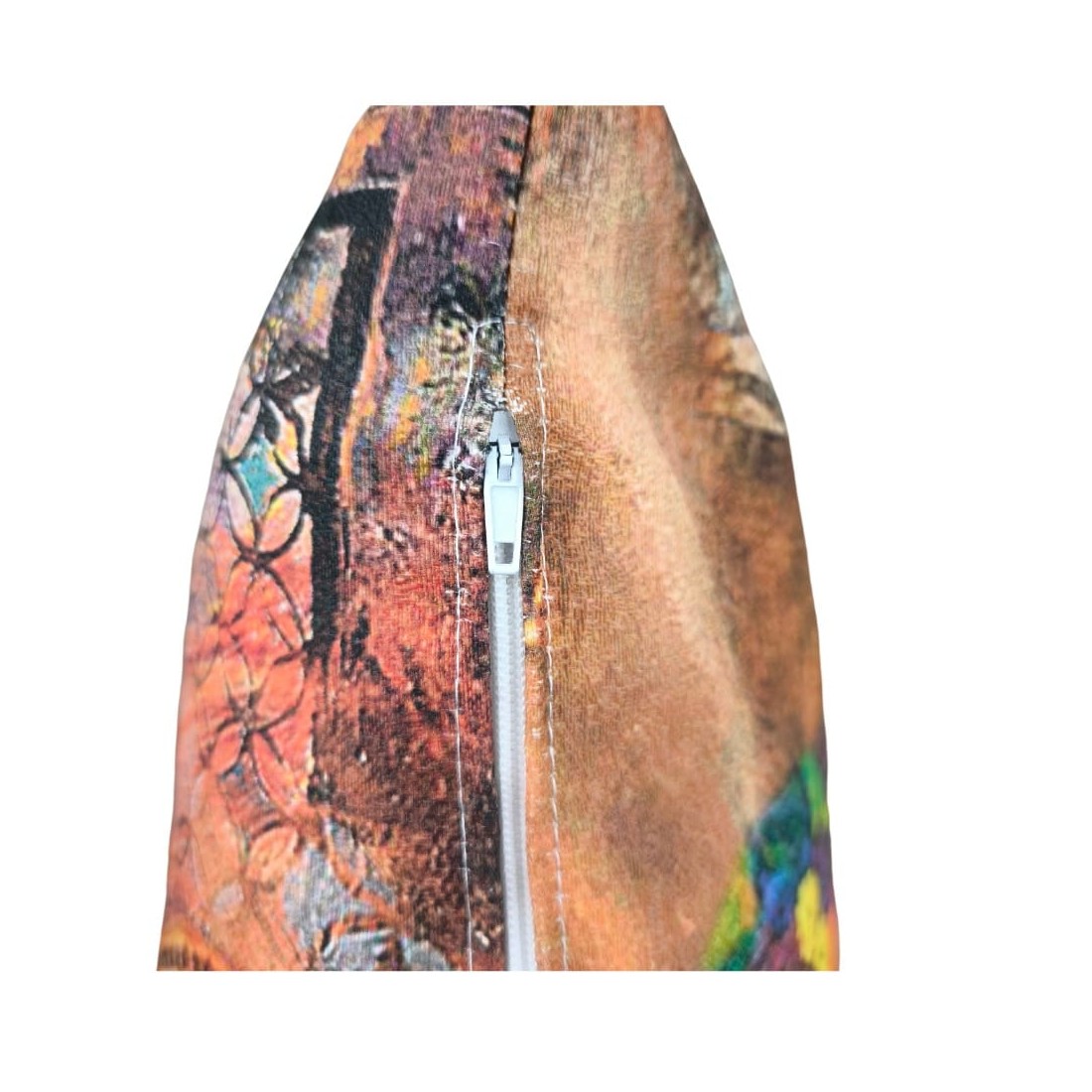 Funda de cojin mujer con fondo imagenes de Venecia con colores naranjas, verdes y azules. Cierre con cremallera. Lavable. AURA