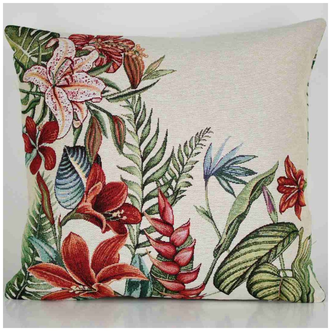 Funda cojín decorativo Jacquard con flores y hojas tropicales con colores vivos BIANKA. Cierre con cremallera. Lavable