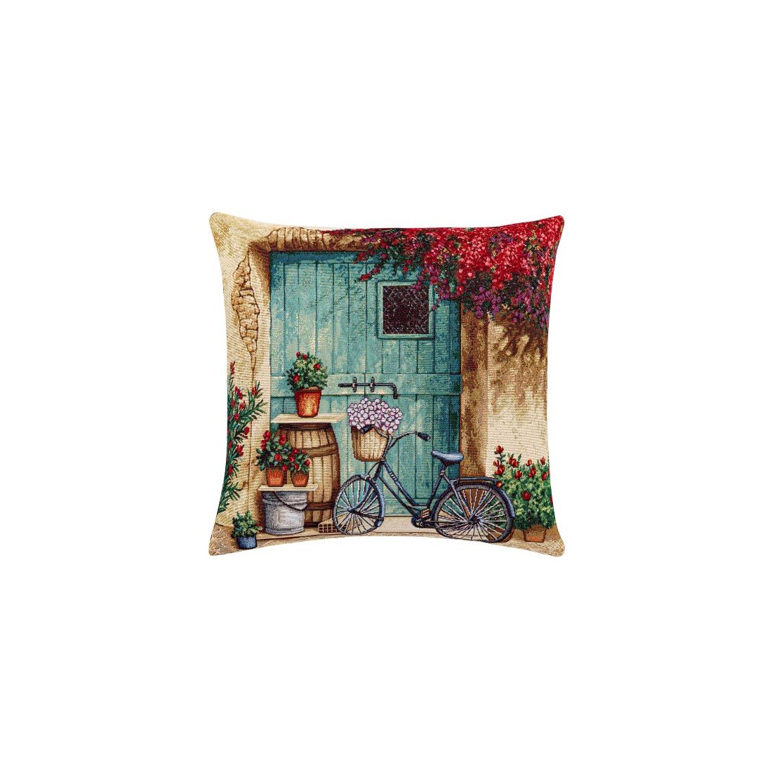 Funda cojin Jacquard de paisaje con una bici con flores, en tonalidades verdes FRONT. Cierre con cremallera