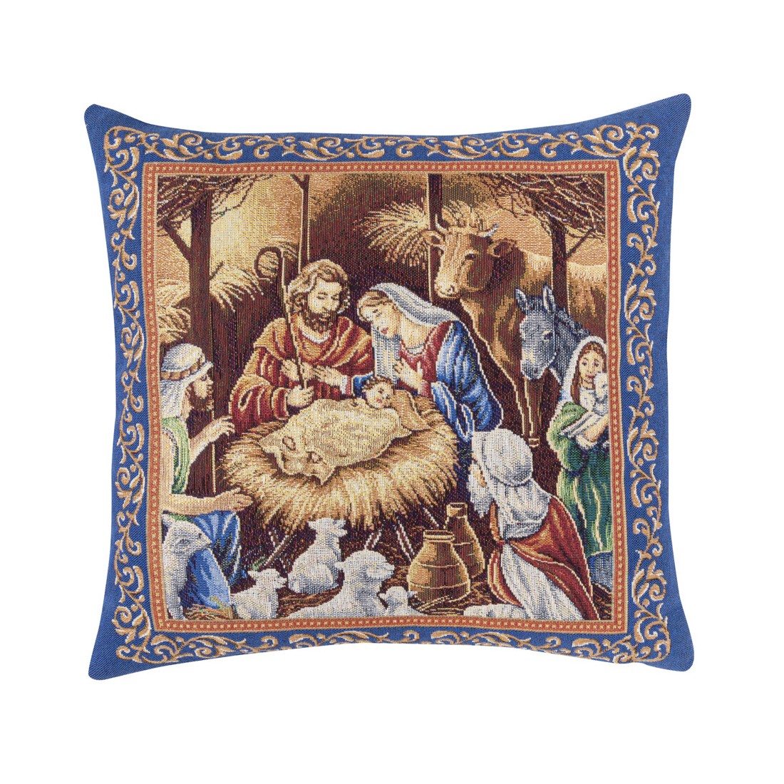 Funda cojin Jacquard con la imagen del nacimiento de Jesus y la adoracion de los pastores en fondo Azul y borde ornamental dorado. Cierre con cremallera. NATIVIDAD C.21