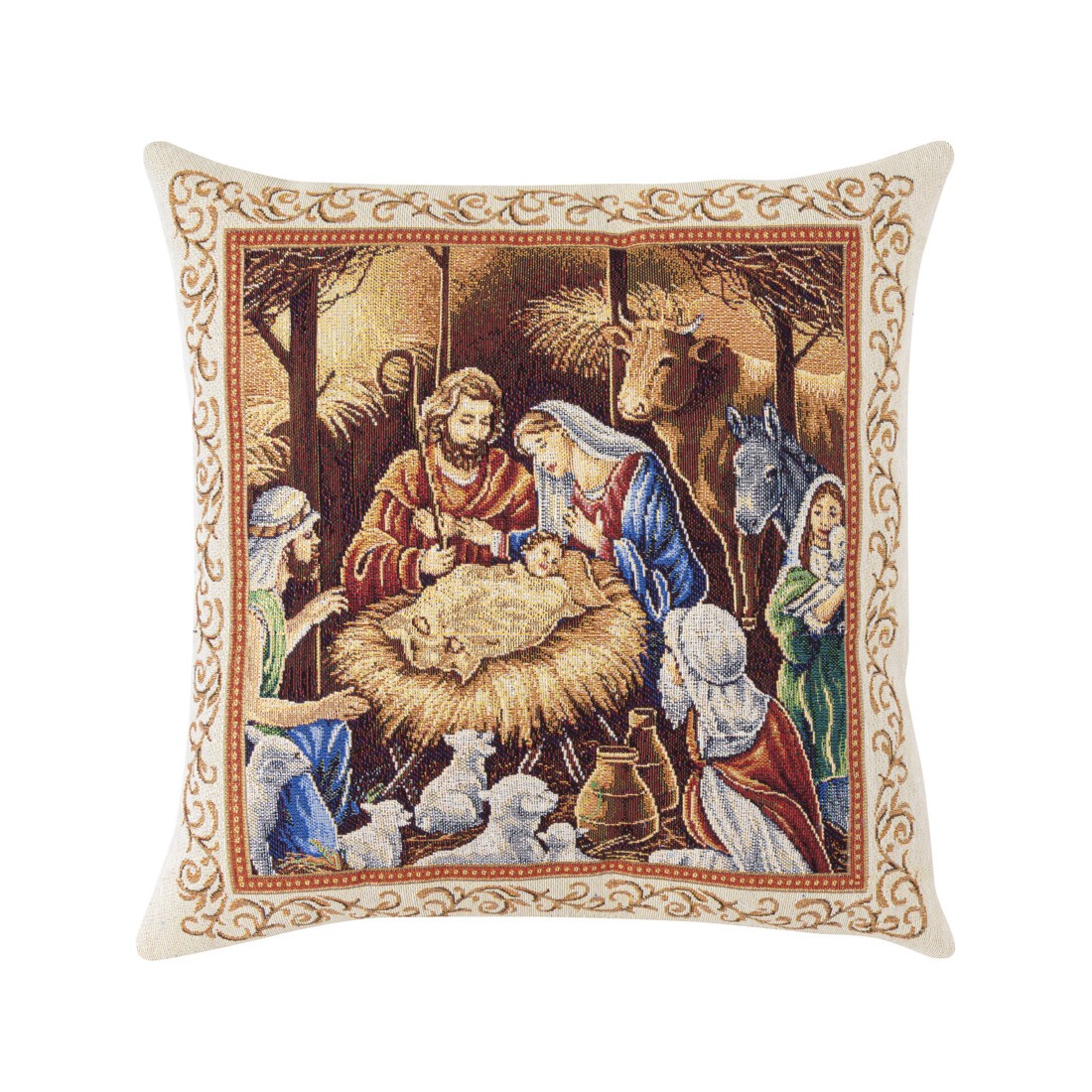 Funda cojin Jacquard con la imagen del nacimiento de Jesus y la adoracion de los pastores en fondo Beig y borde ornamental dorado. Cierre con cremallera. NATIVIDAD C.41