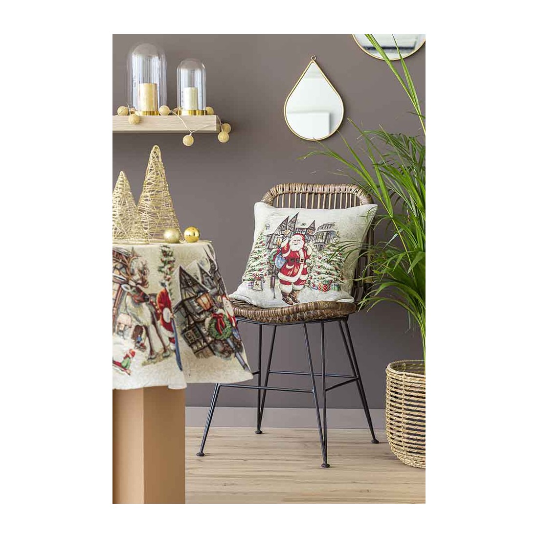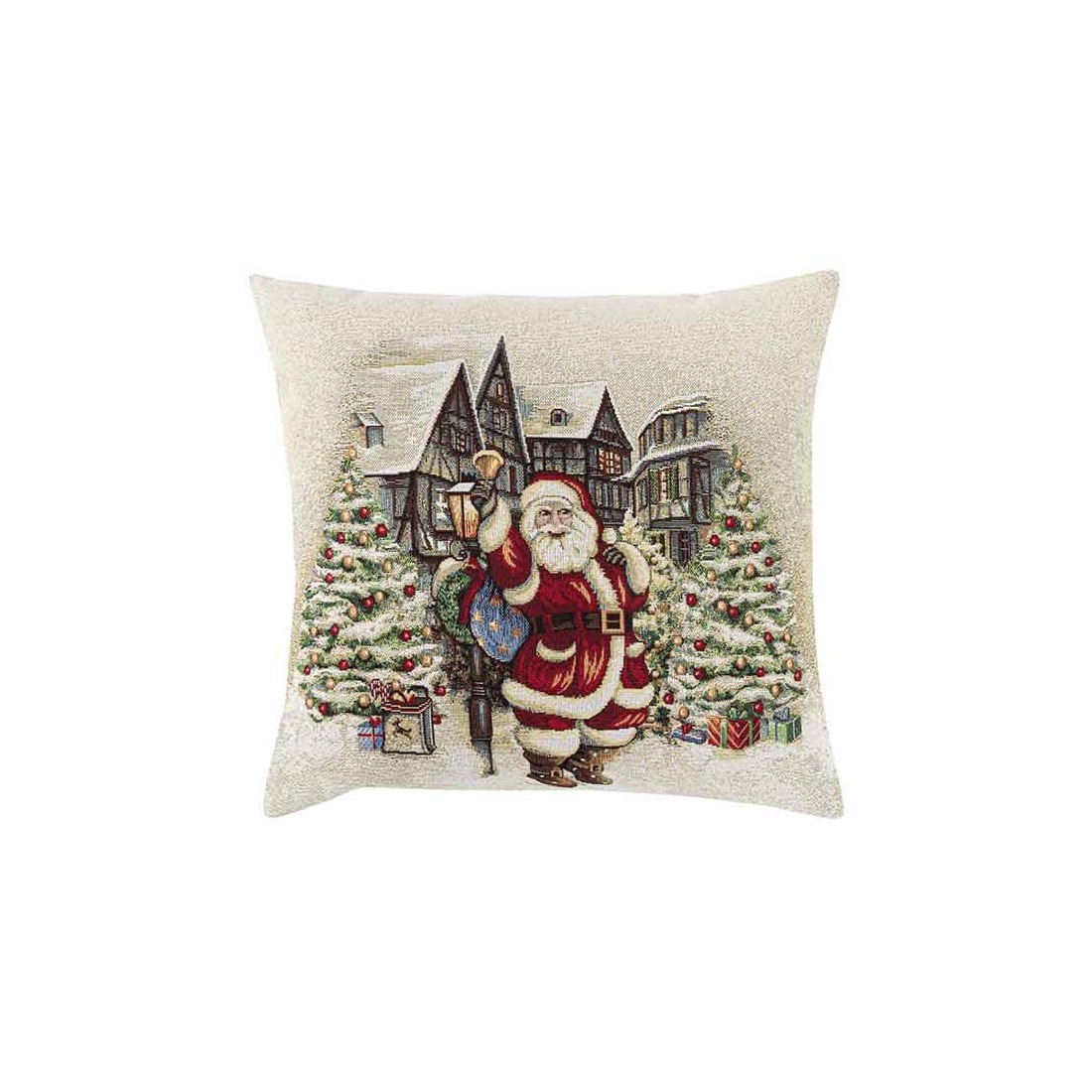 Funda cojín Jacquard con Papa Noel en una villa navideña. Con tonos beig y dorados. Cierre con cremallera. Lavable.
