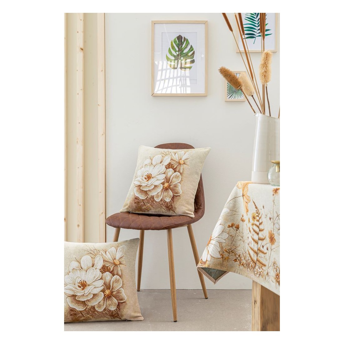Funda cojin Jacquard con flores blancas y tonos dorados en fondo beig NITRA. Cierre con cremallera. Lavable