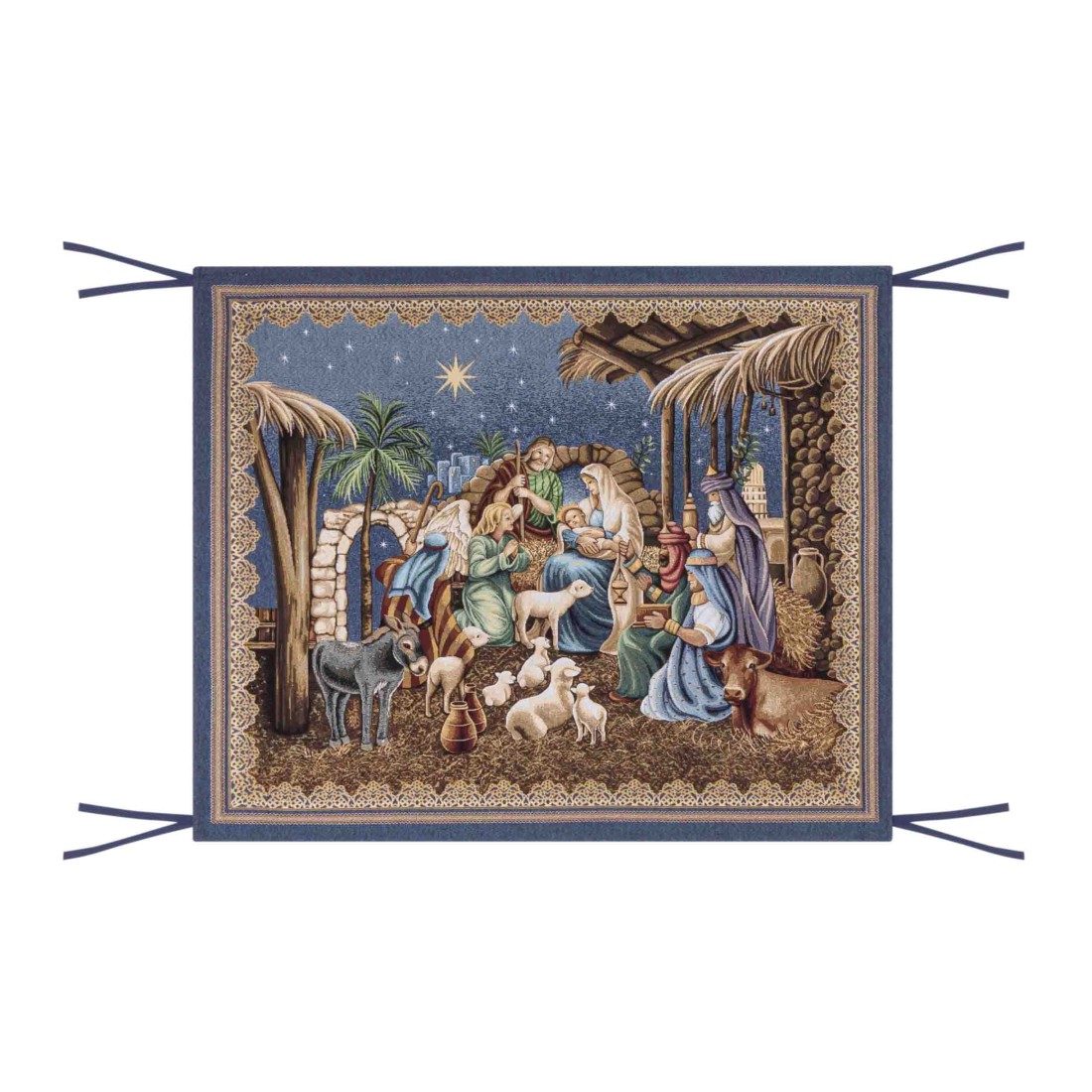 Balconera tejido Jacquard con la adoracion de Jesus con fondo azul NATIVIDAD