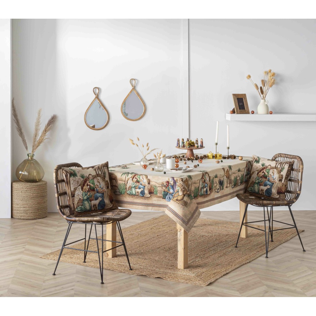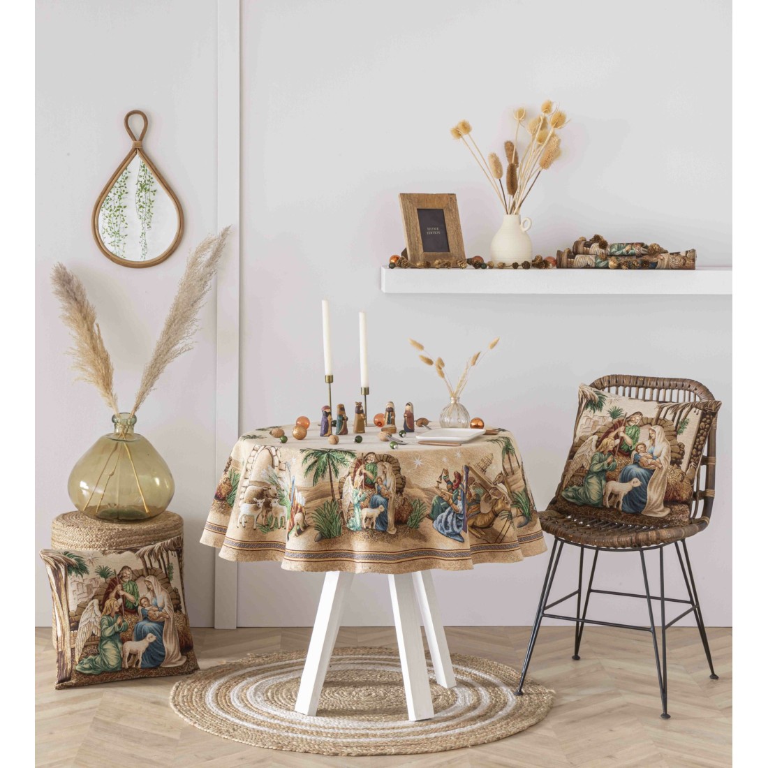 Mantel de navidad de tejido jacquard con imágenes de la ADORACION a la SAGRADA FAMILIA, con los Reyes Magos, Pastores y Angeles. Su fondo es beig , con detalles dorados. Lavable. SAGRADA FAMILIA