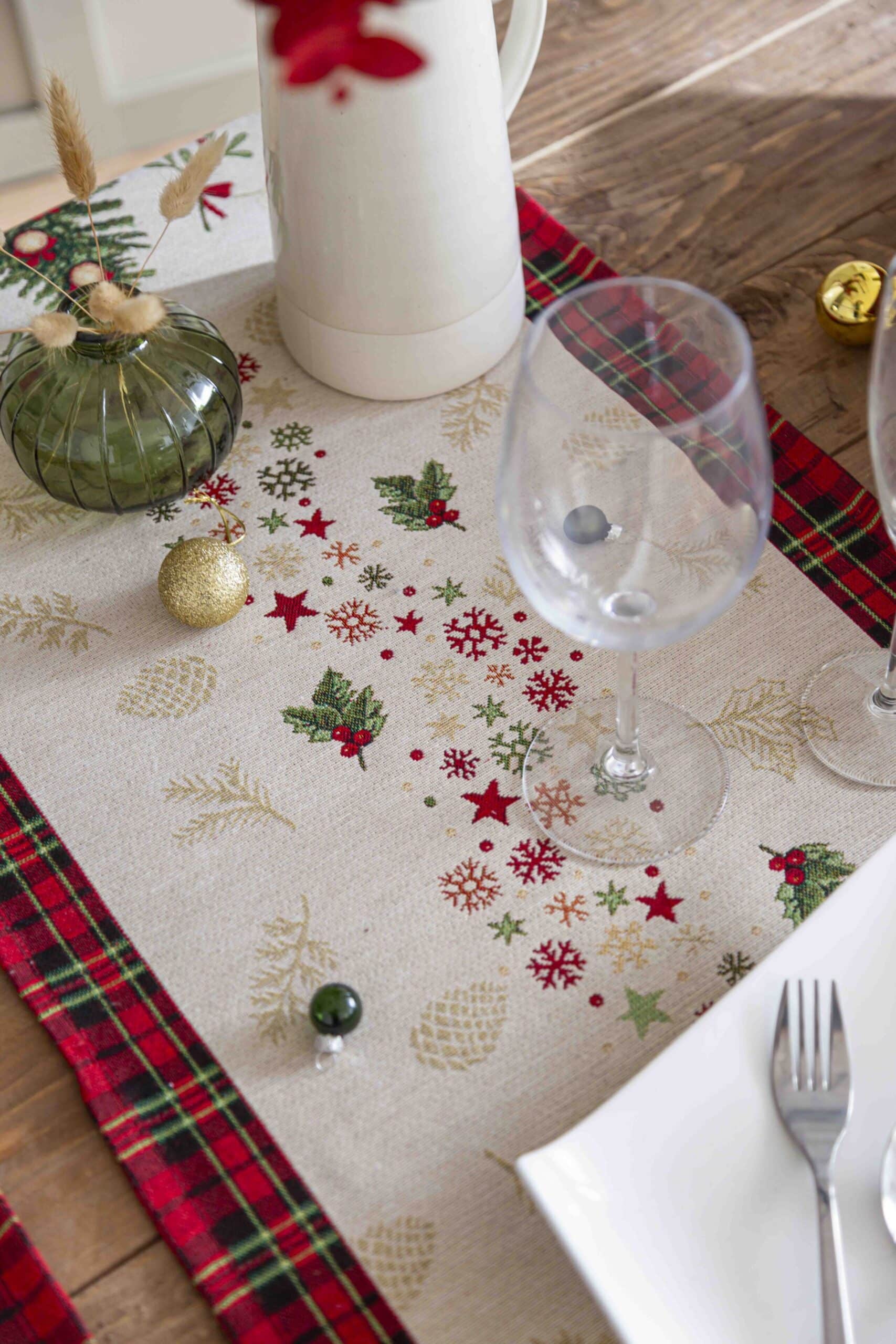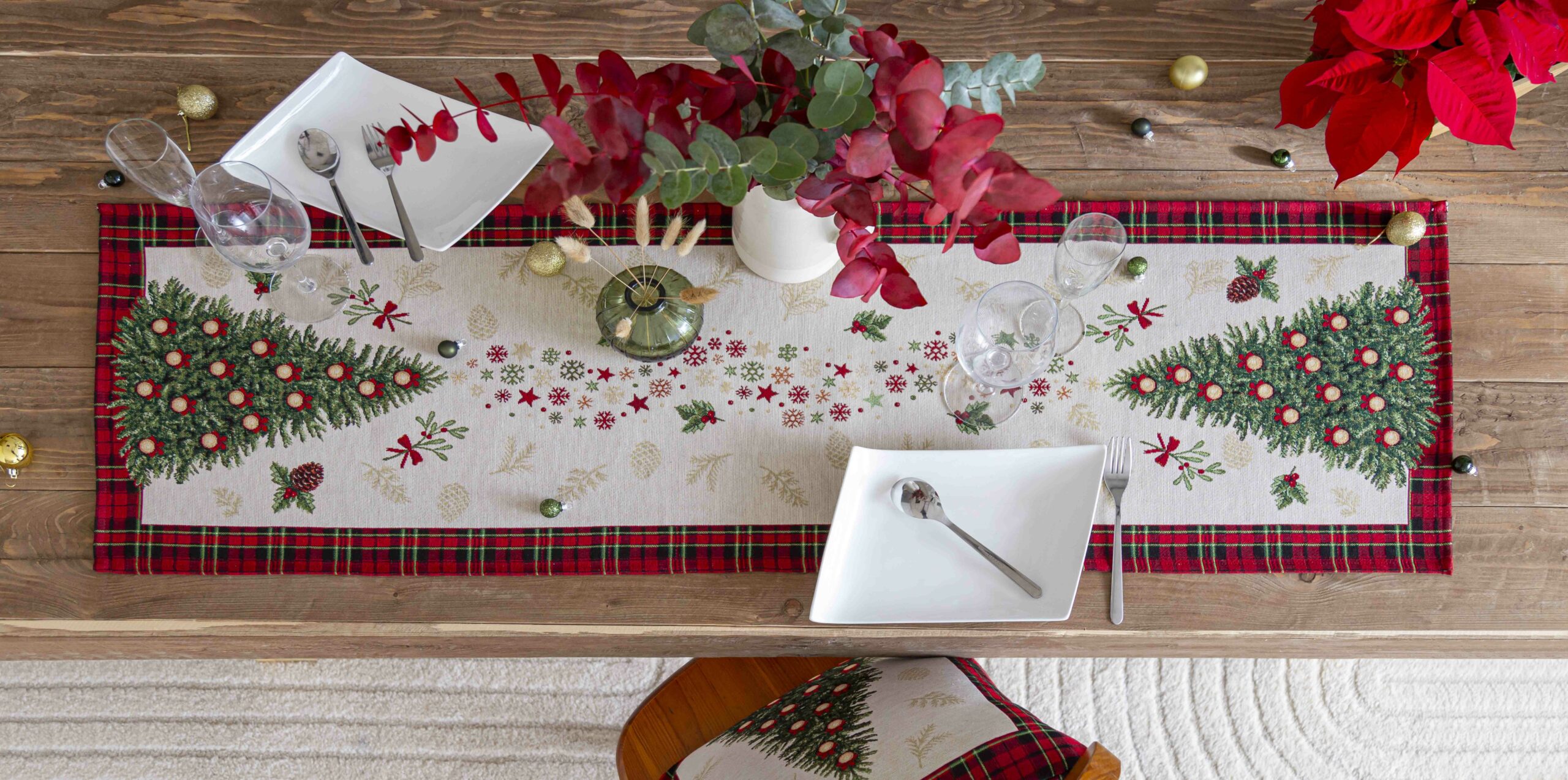 Camino de mesa de tejido jacquard con Arboles de Navidad en las esquinas y con borde de cuadros negro y rojo. Destacan los tonos beig de su fondo con el color verde y rojo, y unos destellos de brillo dorado. Lavable. SAPIN