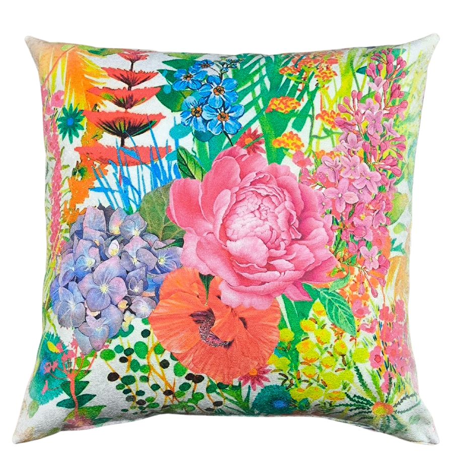 Funda de cojin con diversidad de flores como amapola, hortensia en tonalidades de rojos, rosas, azules y verdes. Cierre con cremallera. Lavable. DEMETER