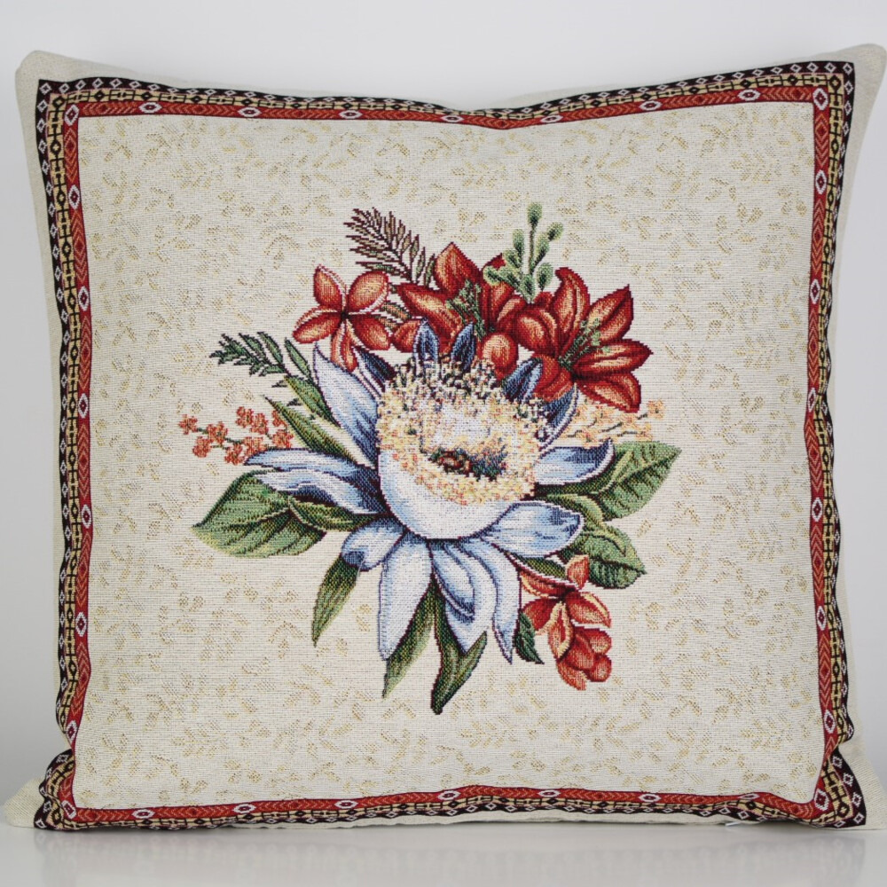 Funda cojin Jacquard con flor central lotus con tonos azules, rojos, verdes y fondo beig, lavable. Cierre con cremallera. LOTUS