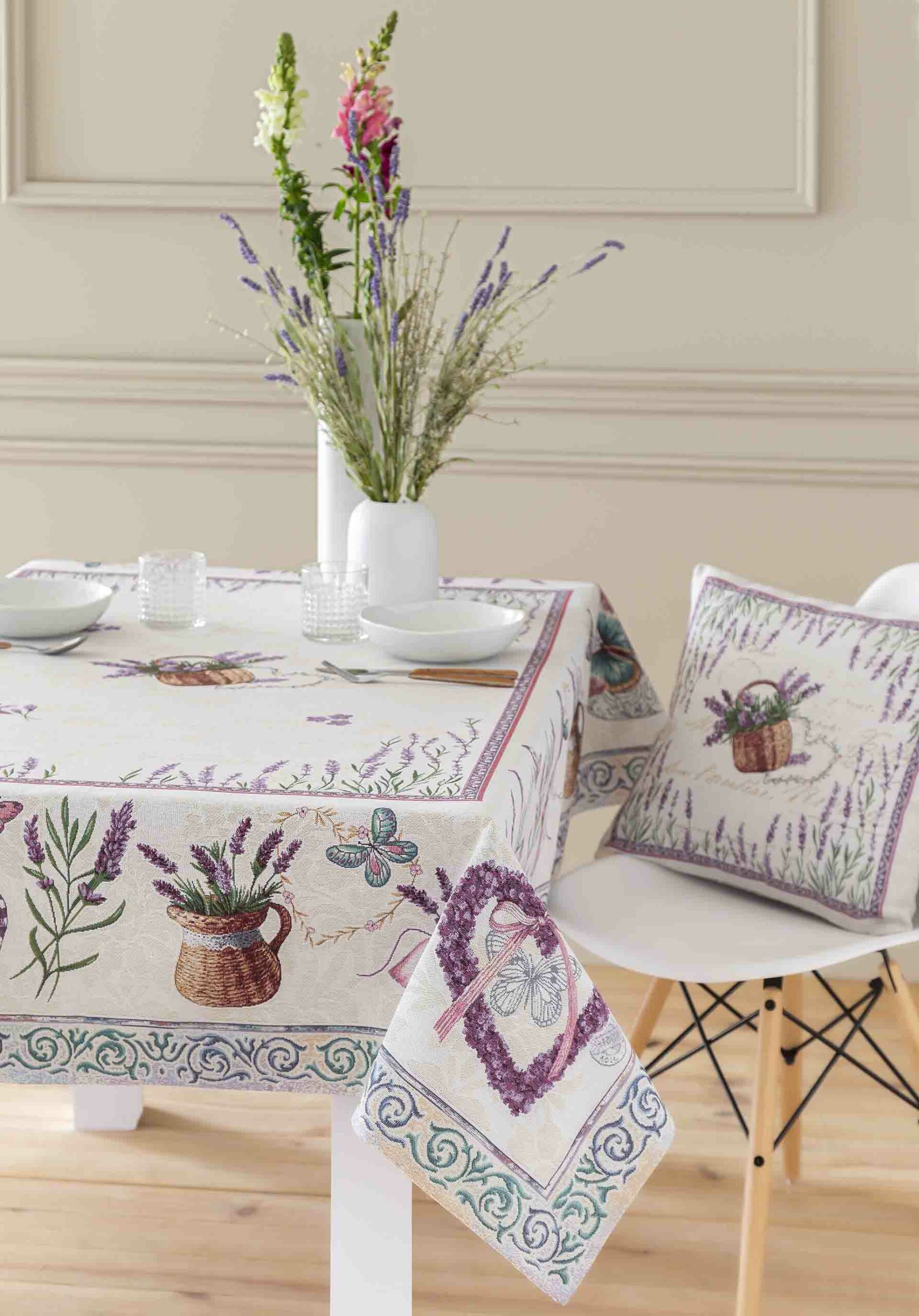 Funda cojin Jacquard con flores de lavanda y cesto de mimbre central LAVANDER. Cierre con cremallera.